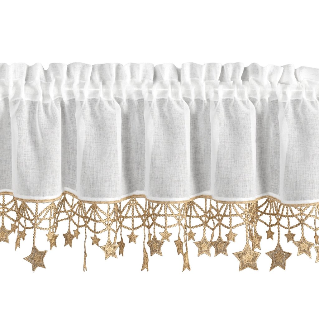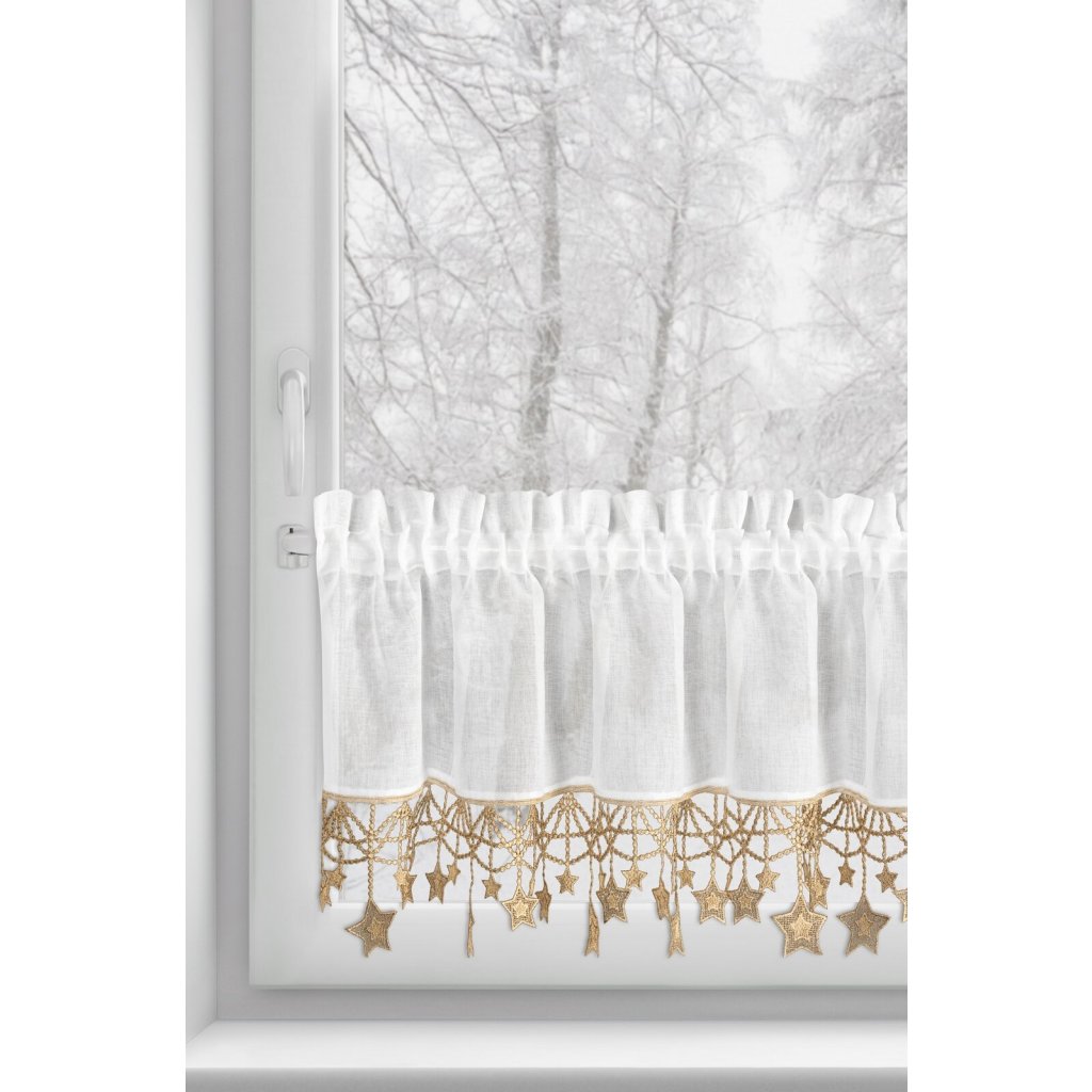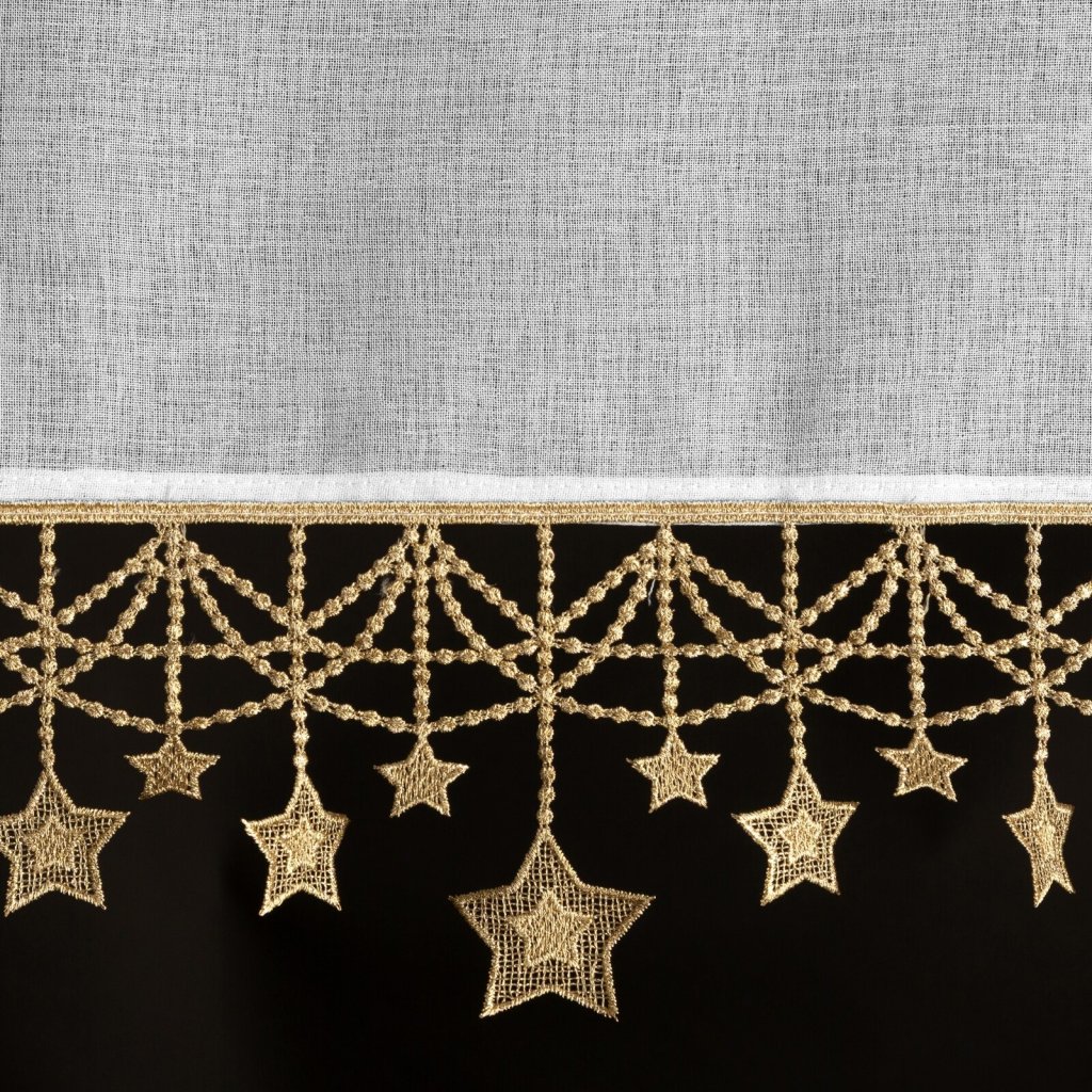 Stylová záclonka se svátečním lemováním o rozměrech 150 × 30 cm je ušita z jemné tkaniny s gramáží 75 GSM . Bílá barva přináší do interiéru světlý a čistý charakter. Materiál tvoří 100% polyester , který je odolný a snadno se udržuje. Barva hvězd: zlatá.Doplňkové parametry