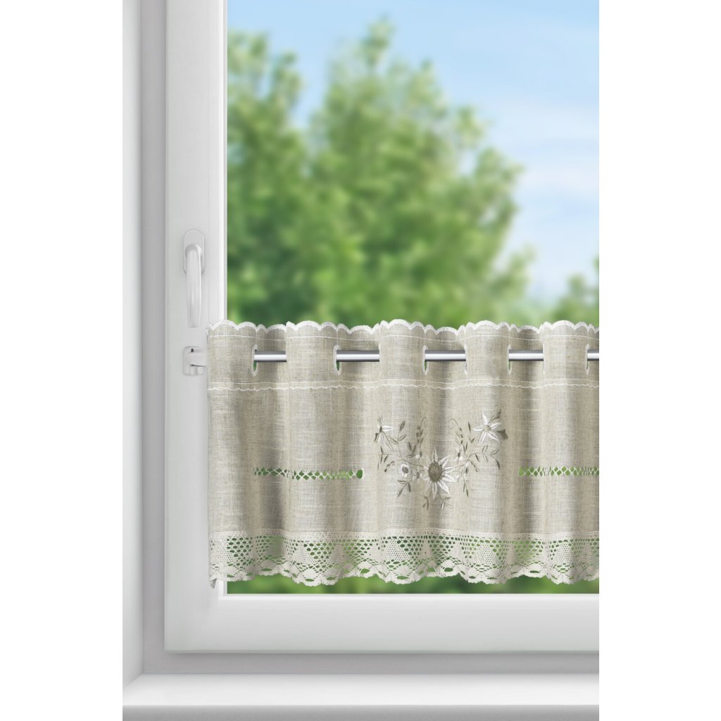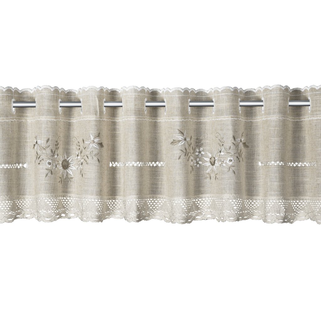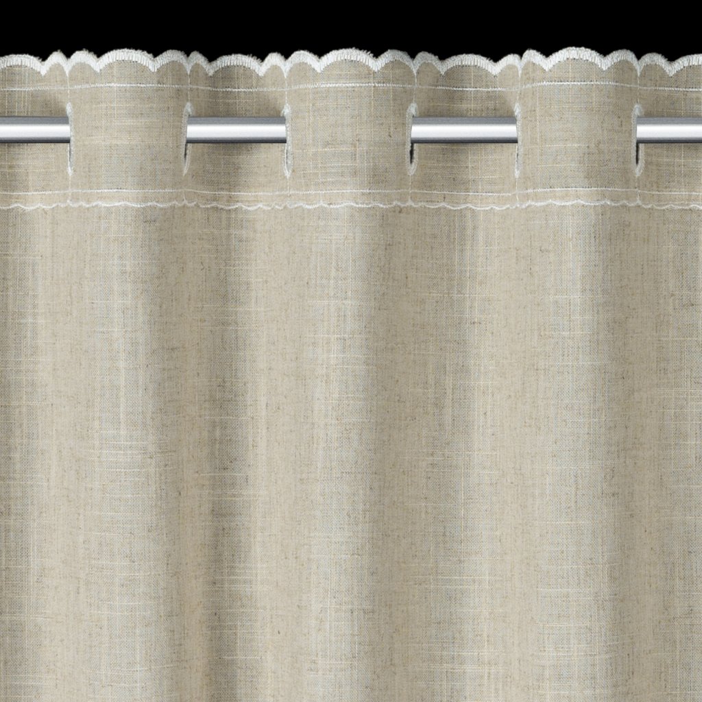 Krátká záclona z látky s přídavkem lnu, zdobená výšivkou, šířka: 150 cm, délka: 30 cm, barva: béžová, hmotnost: 180 GSM, složení: 90% polyester, 10% len.Doplňkové parametry