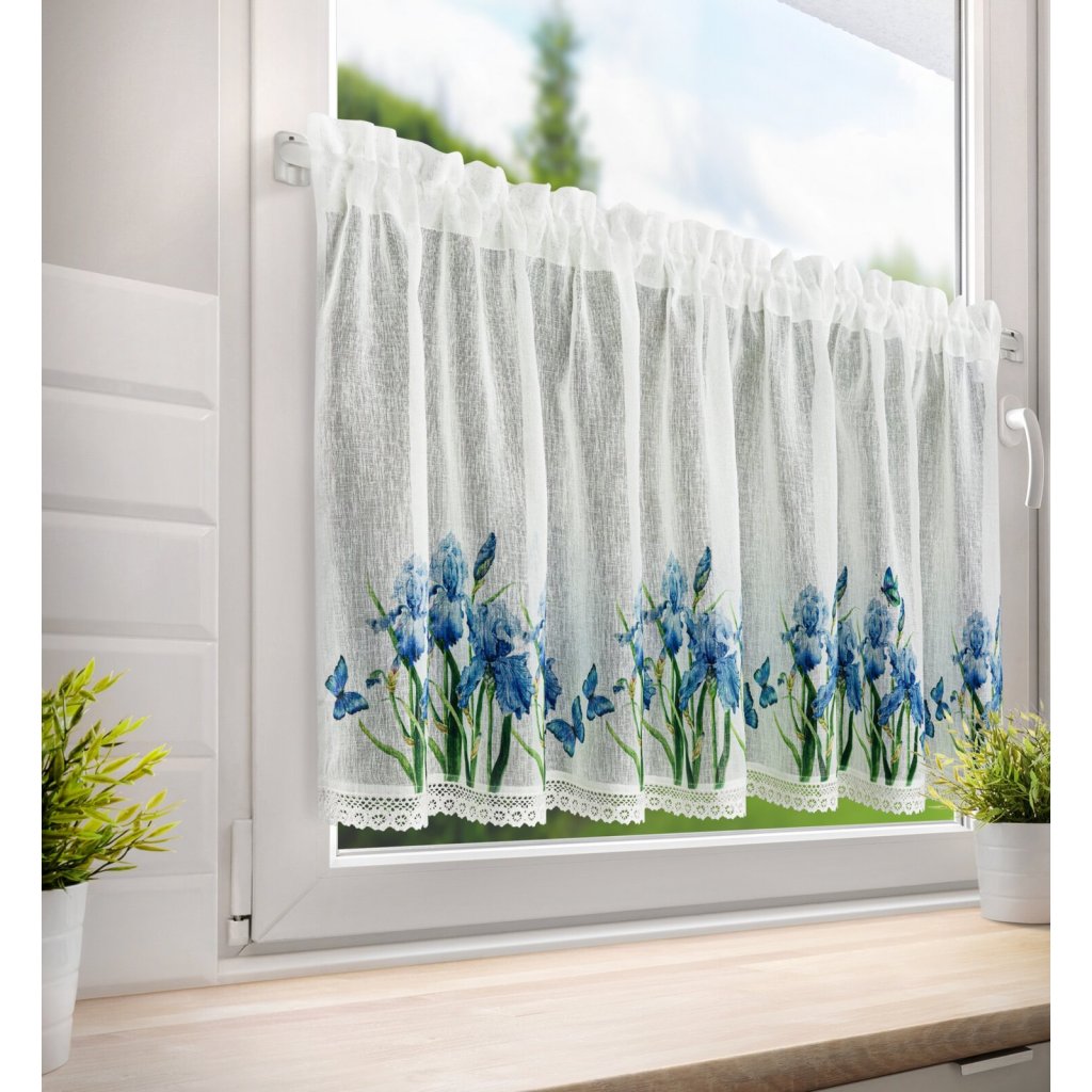 Záclona s potiskem zdobená krajkou. Šířka: 150 cm, délka: 60 cm, barva: bílá/modrá, hmotnost: 110 GSM, složení: 100 % polyesterDoplňkové parametry