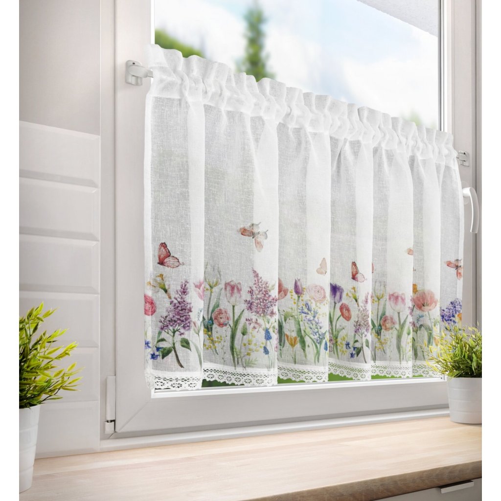 Záclona s potiskem zdobená krajkou, šířka: 150 cm, délka: 60 cm, barva: bílá/barevná, hmotnost: 110 GSM, složení: 100% polyester.Doplňkové parametry