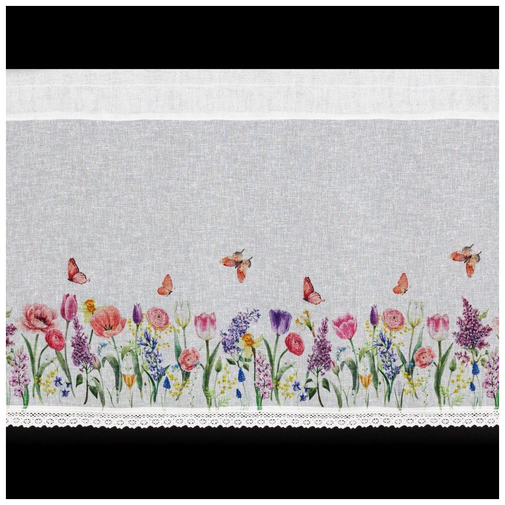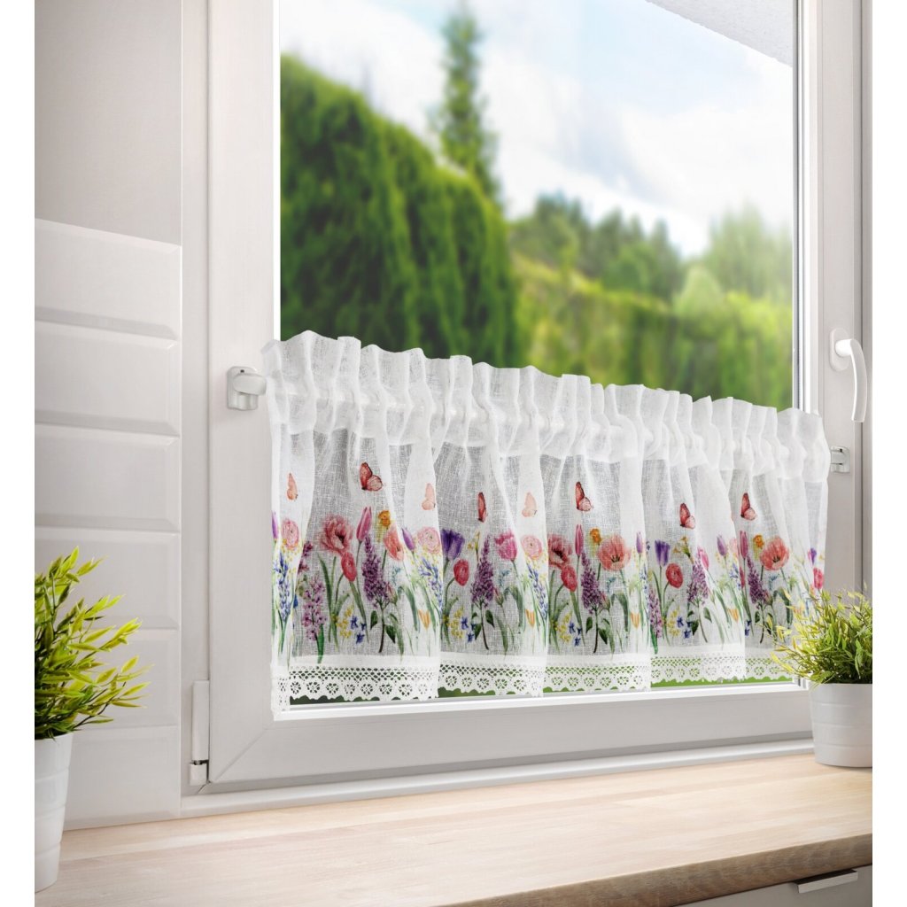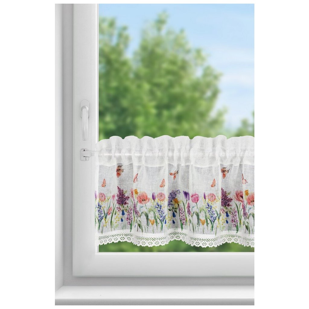 Záclona s potiskem zdobená krajkou, šířka: 150 cm, délka: 30 cm, barva: vícebarevná, hmotnost: 110 GSM, složení: 100% polyester.Doplňkové parametry