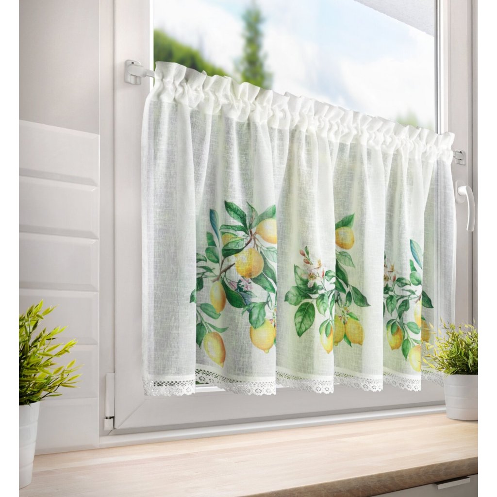 Oživte svou kuchyni svěžím středomořským stylem s touto dekorativní záclonou CLOE s potiskem citrónů a jemným krajkovým lemem. Bílý podklad krásně propouští světlo, zatímco výrazný ovocný motiv vnáší do prostoru barvu a pohodu. Šířka: 150 cm, délka: 60 cm, barva: vícebarevná, hmotnost: 150 GSM, složení: 100% polyester.Doplňkové parametry