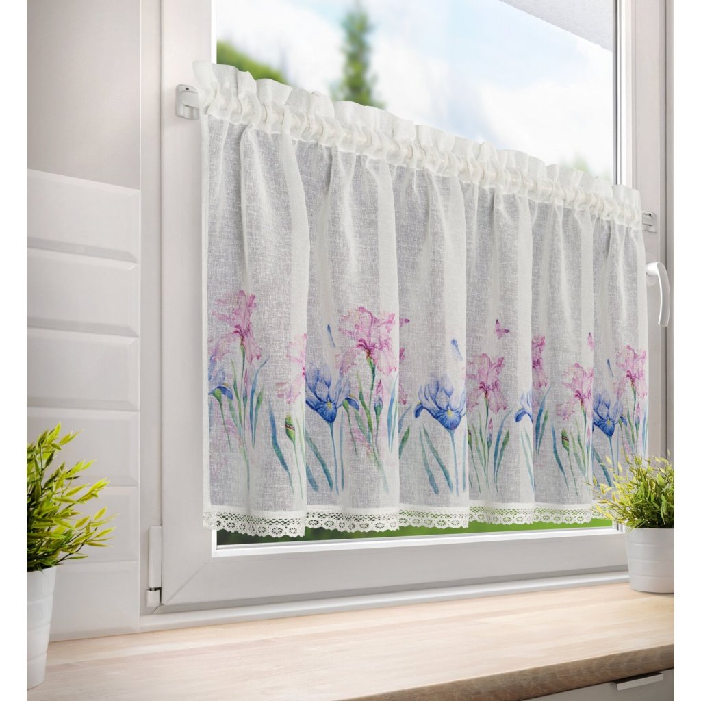Gázová záclona zdobená potiskem letních květin je půvabnou dekorací, která vnese do interiéru svěží, jarní atmosféru. Celek navíc doplňuje decentní krajka všitá ve spodní části látky, která dodává elegantní a romantický charakter. Šířka: 150 cm, délka: 60 cm, barva: vícebarevná, hmotnost: 110 GSM, složení: 100% polyester.Doplňkové parametry