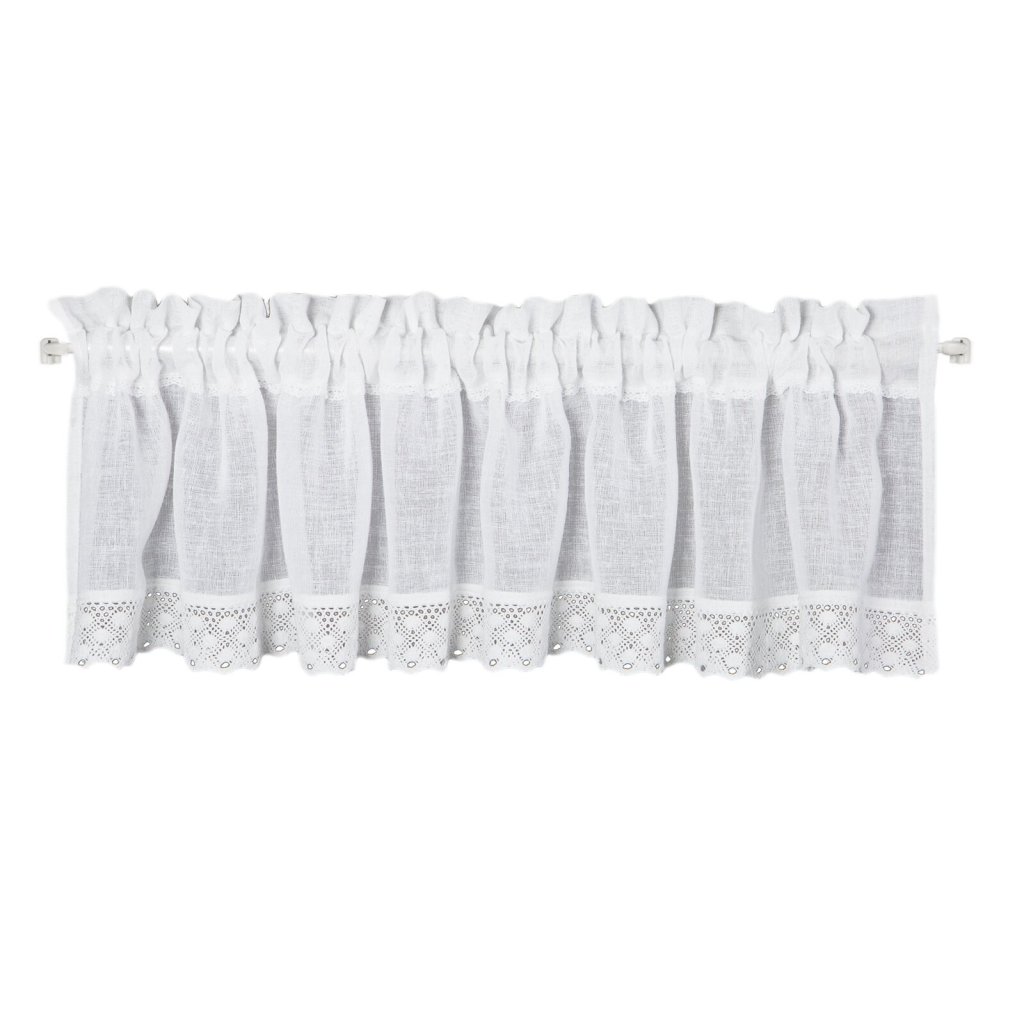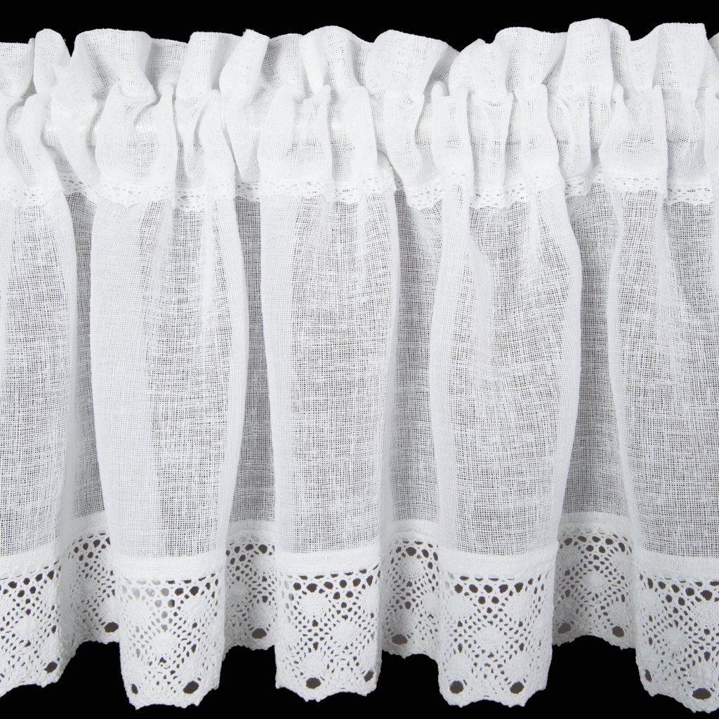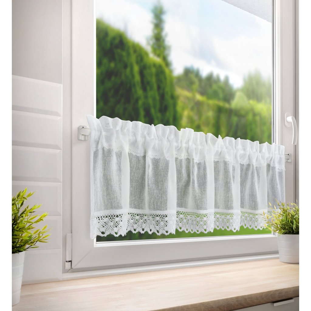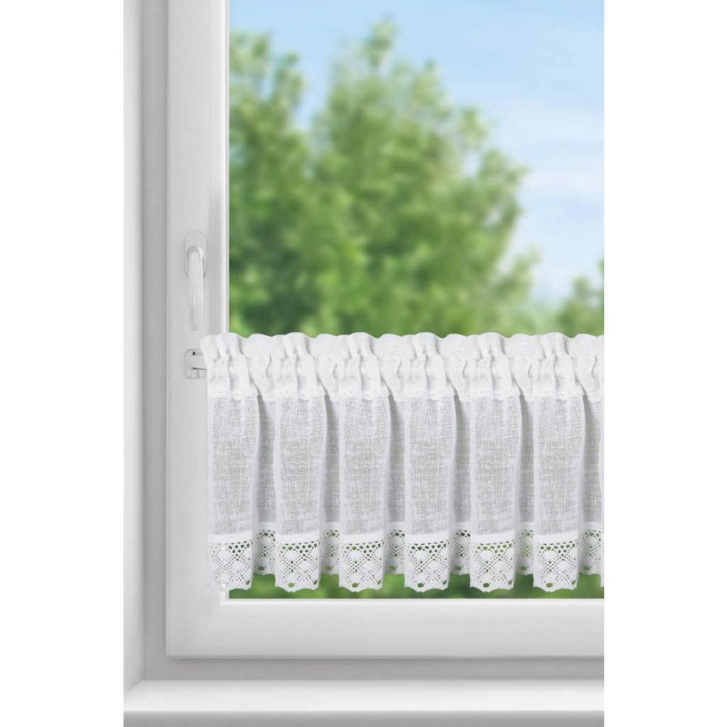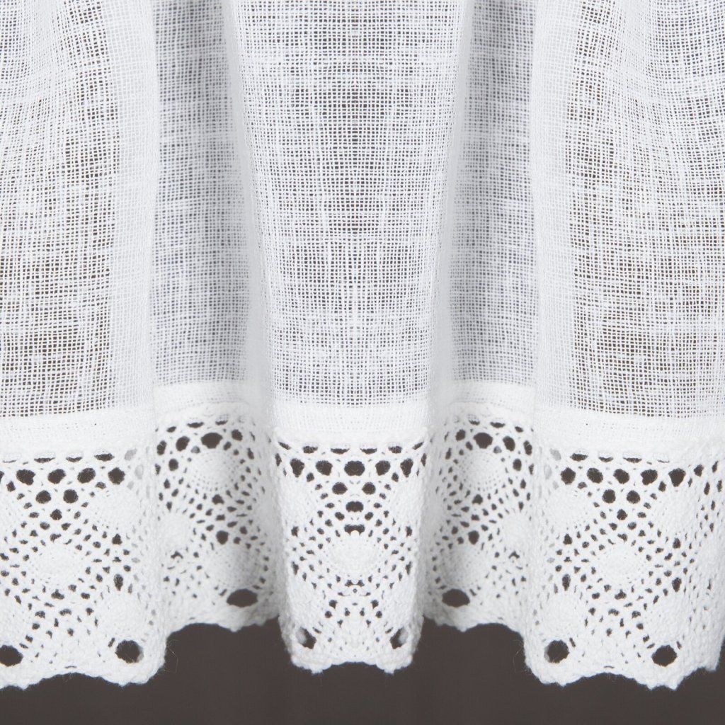 Záclona zdobená krajkou. Šířka: 30 cm, délka: 150 cm, barva: bílá, hmotnost: 110 GSM, složení: 100 % polyesterDoplňkové parametry