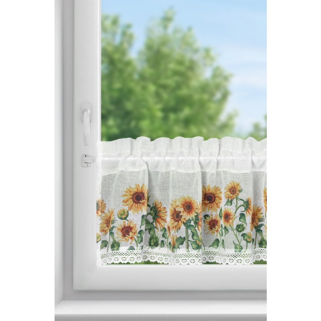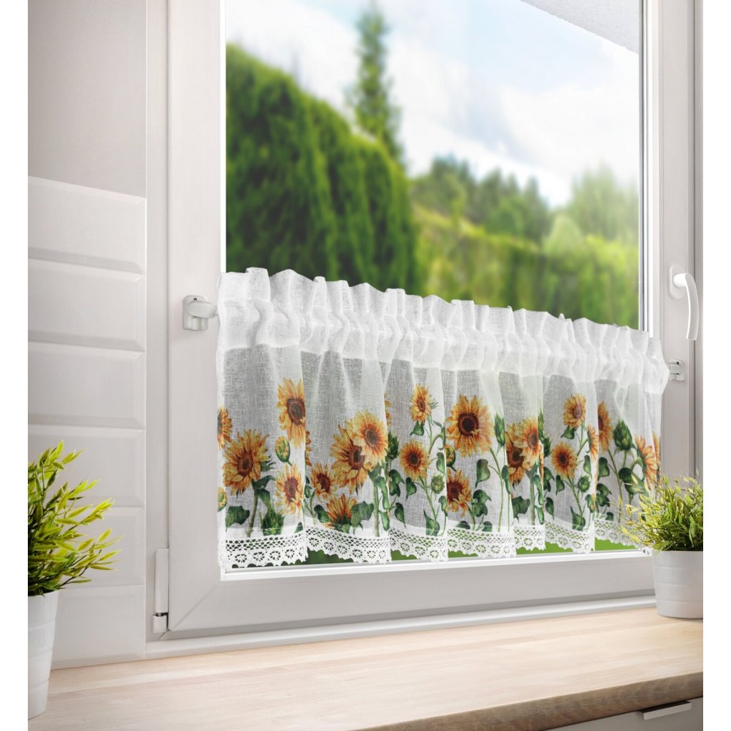 Záclona s potiskem zdobená krajkou, šířka: 150 cm, délka: 30 cm, barva: vícebarevná, hmotnost: 110 GSM, složení: 100% polyester.Doplňkové parametry