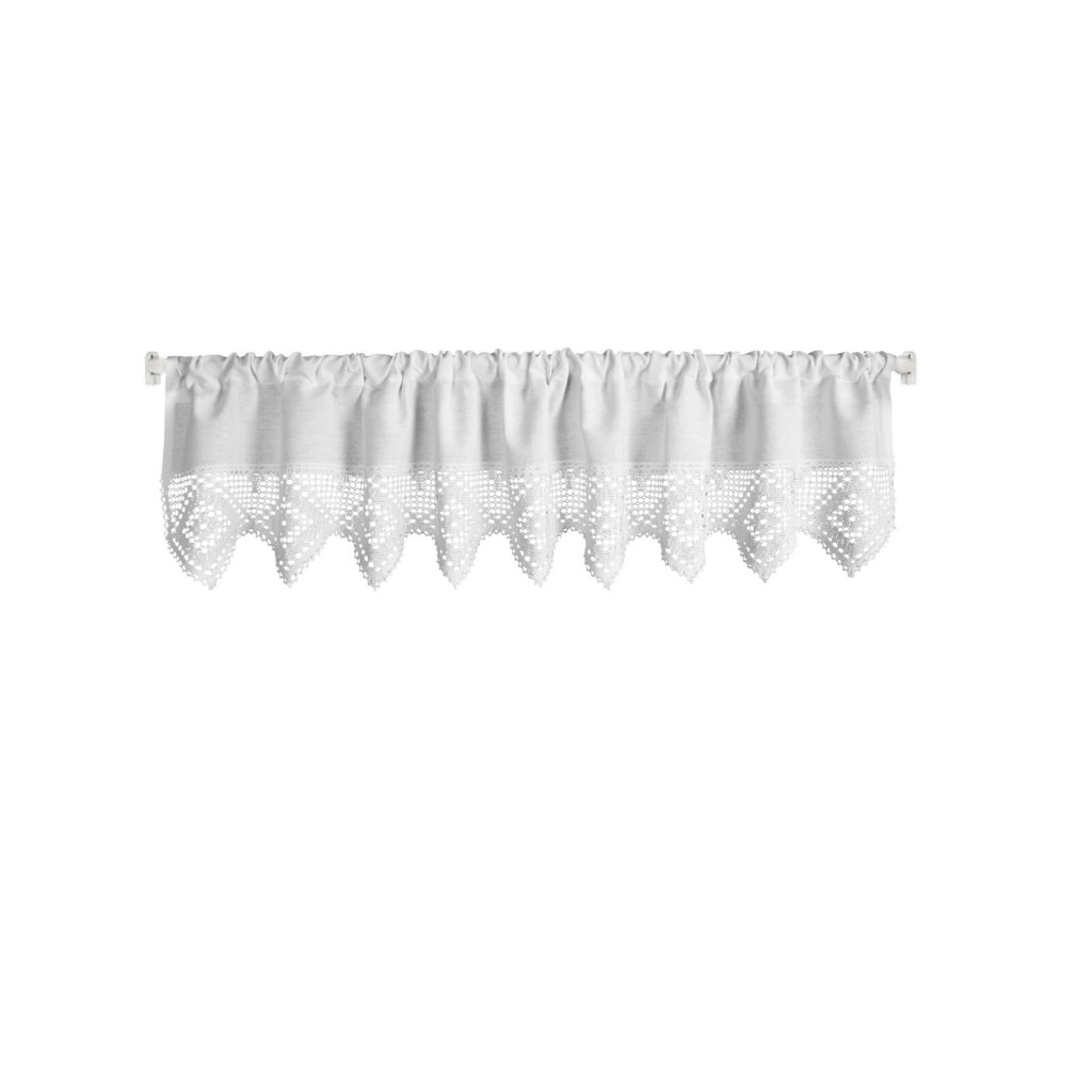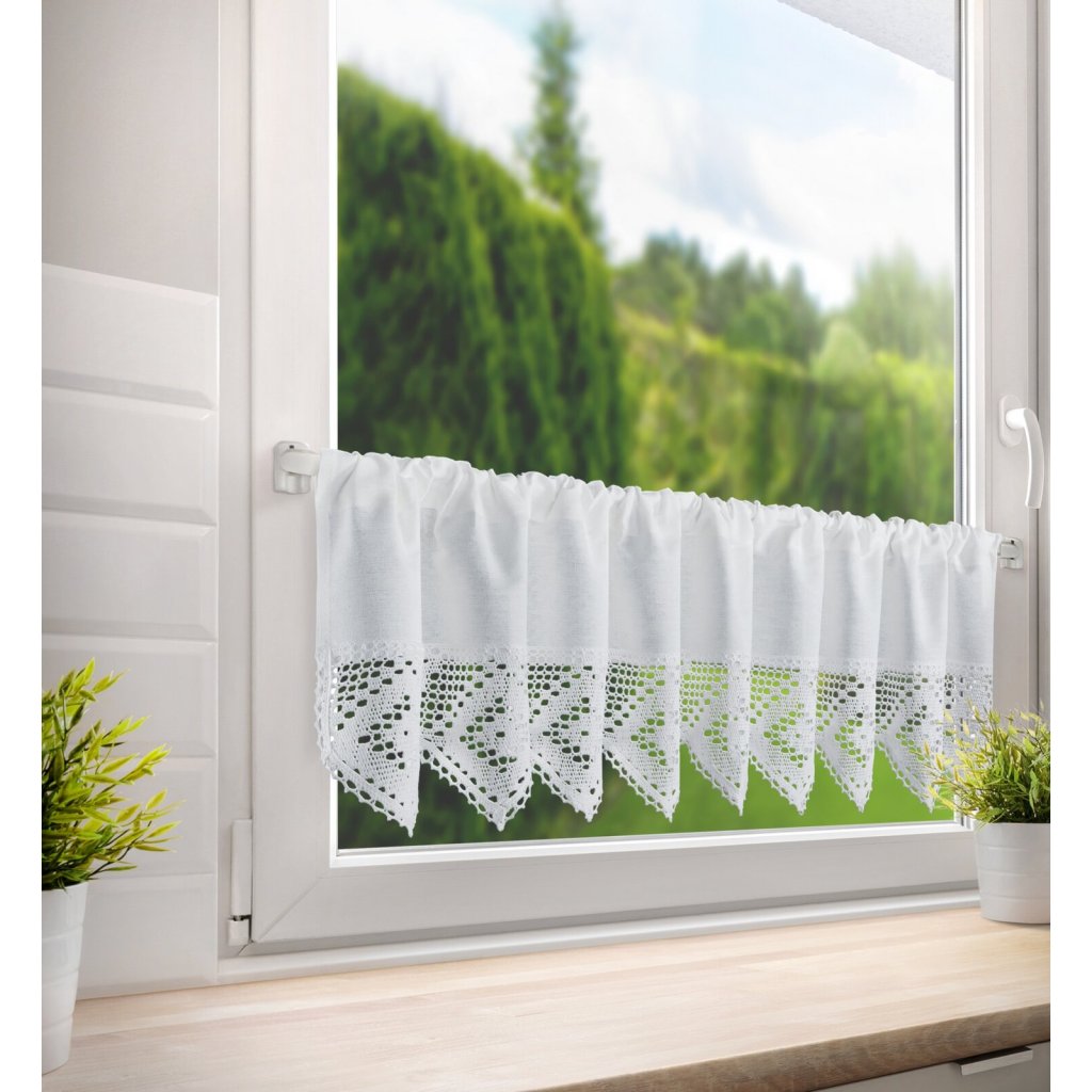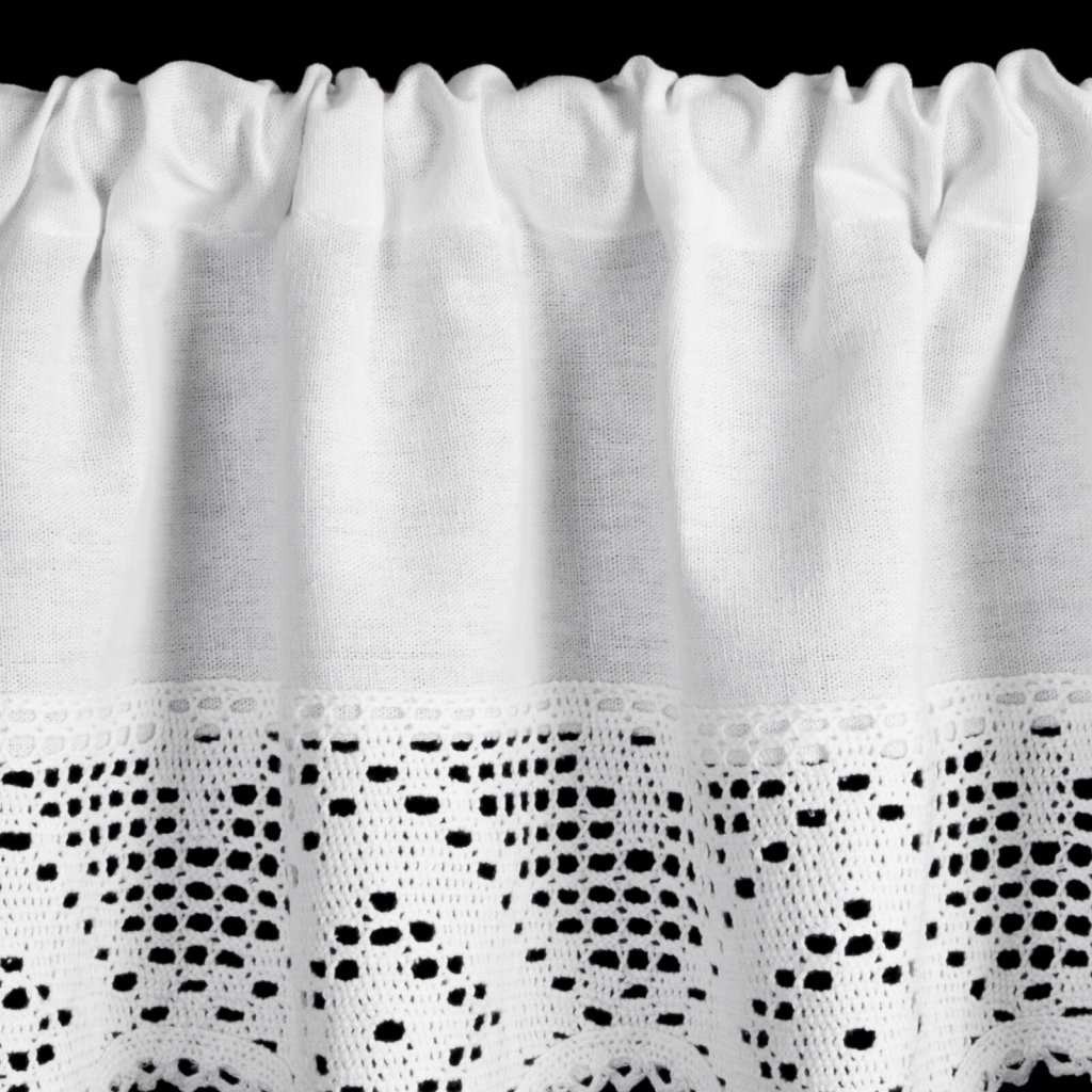 Záclona zdobená krajkou. Šířka: 150 cm, délka: 30 cm, barva: bílá, hmotnost: 180 GSM, složení: 60% bavlna 40% polyesterDoplňkové parametry