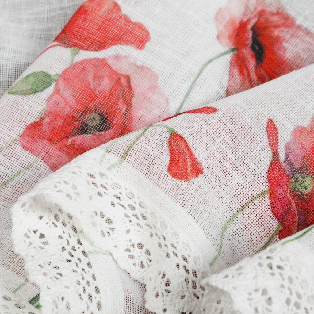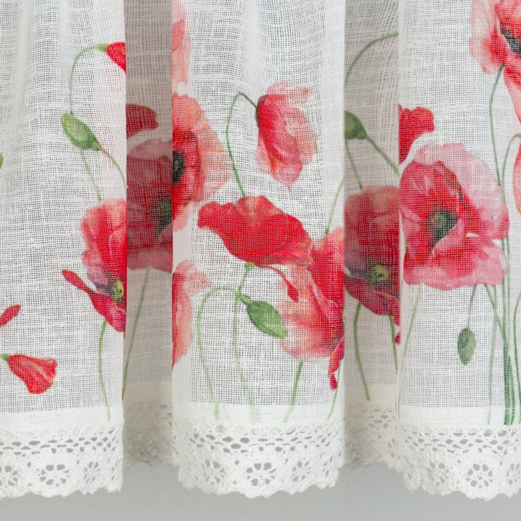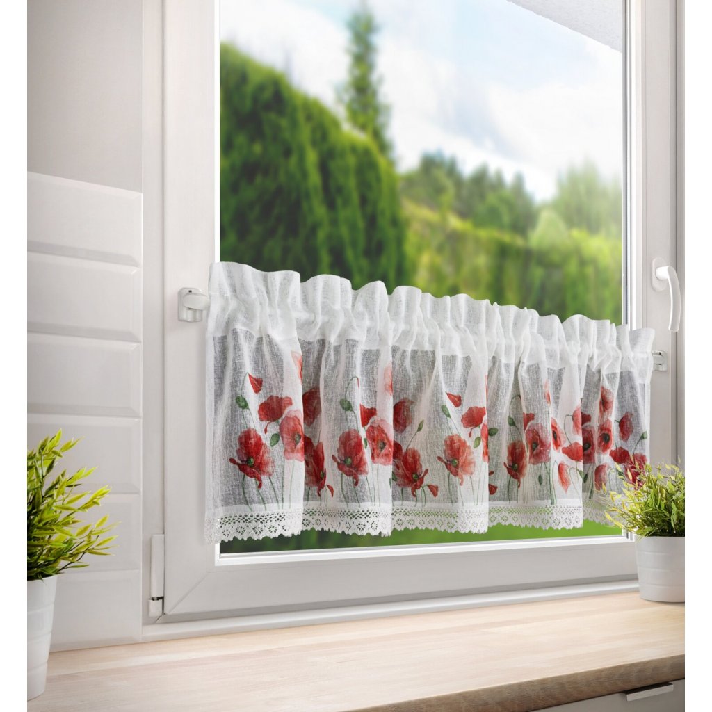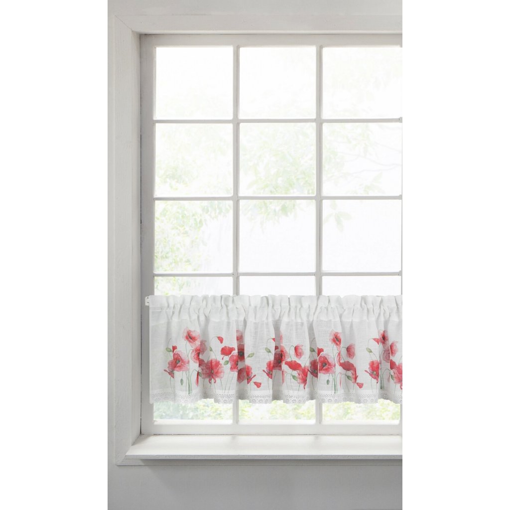 Záclona s potiskem zdobená krajkou. Šířka: 150 cm, délka: 30 cm, barva: bílá / vícebarevná, hmotnost: 165 GSM, složení: 100 % polyesterDoplňkové parametry
