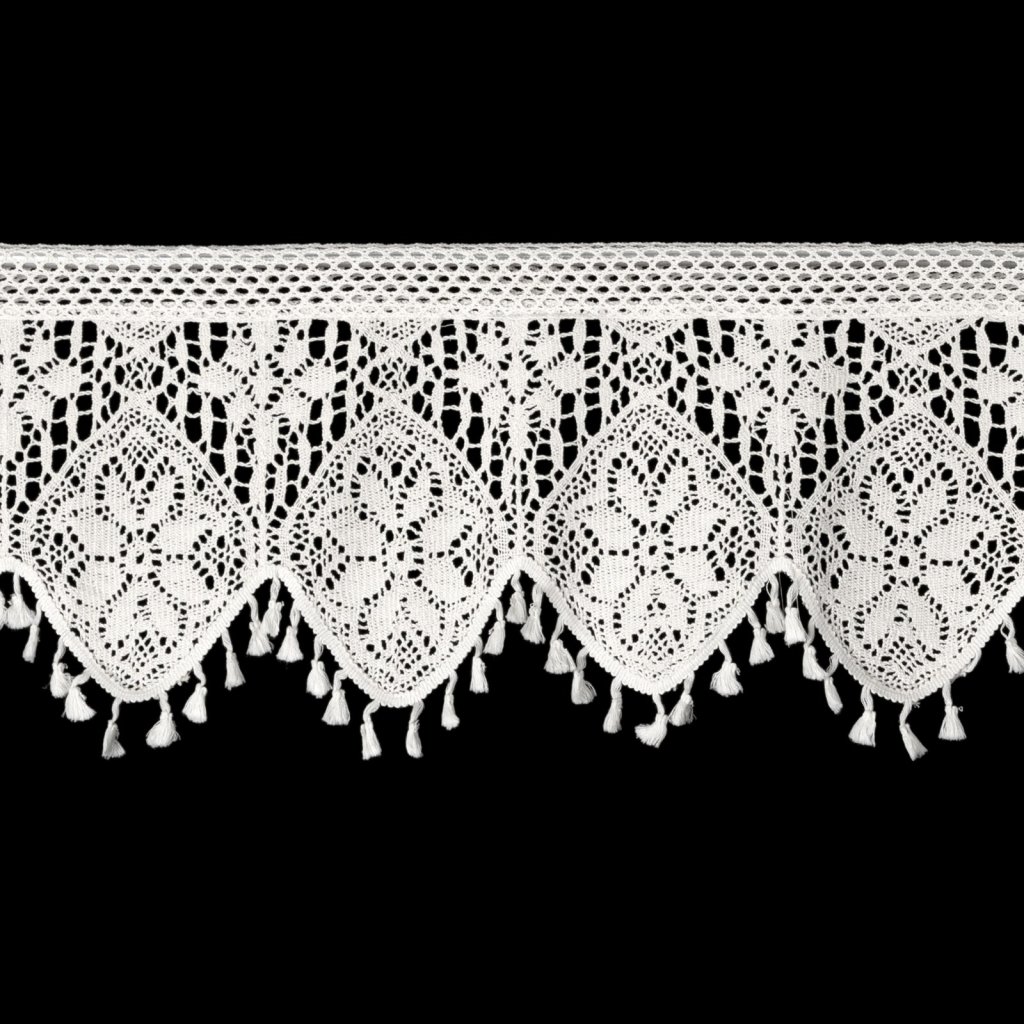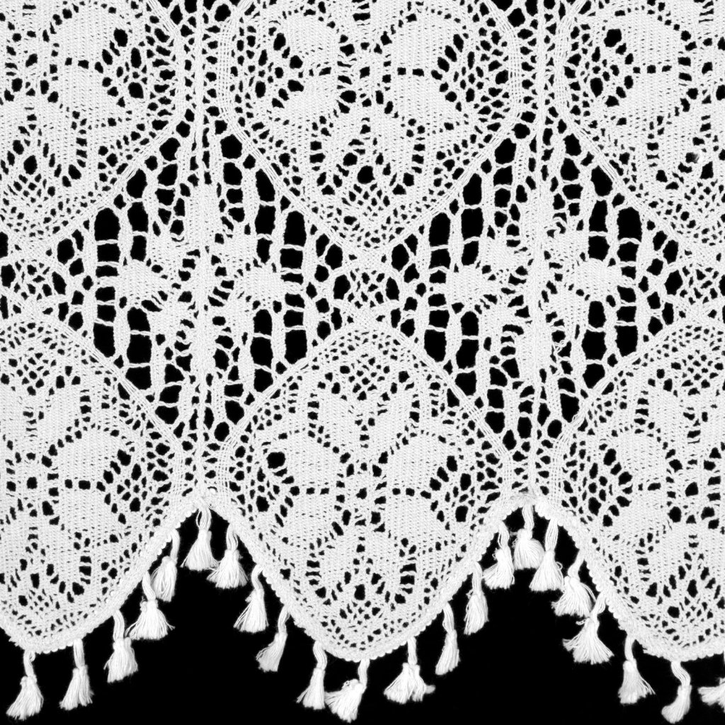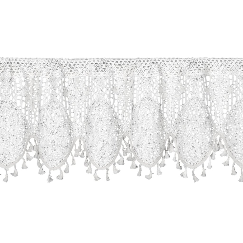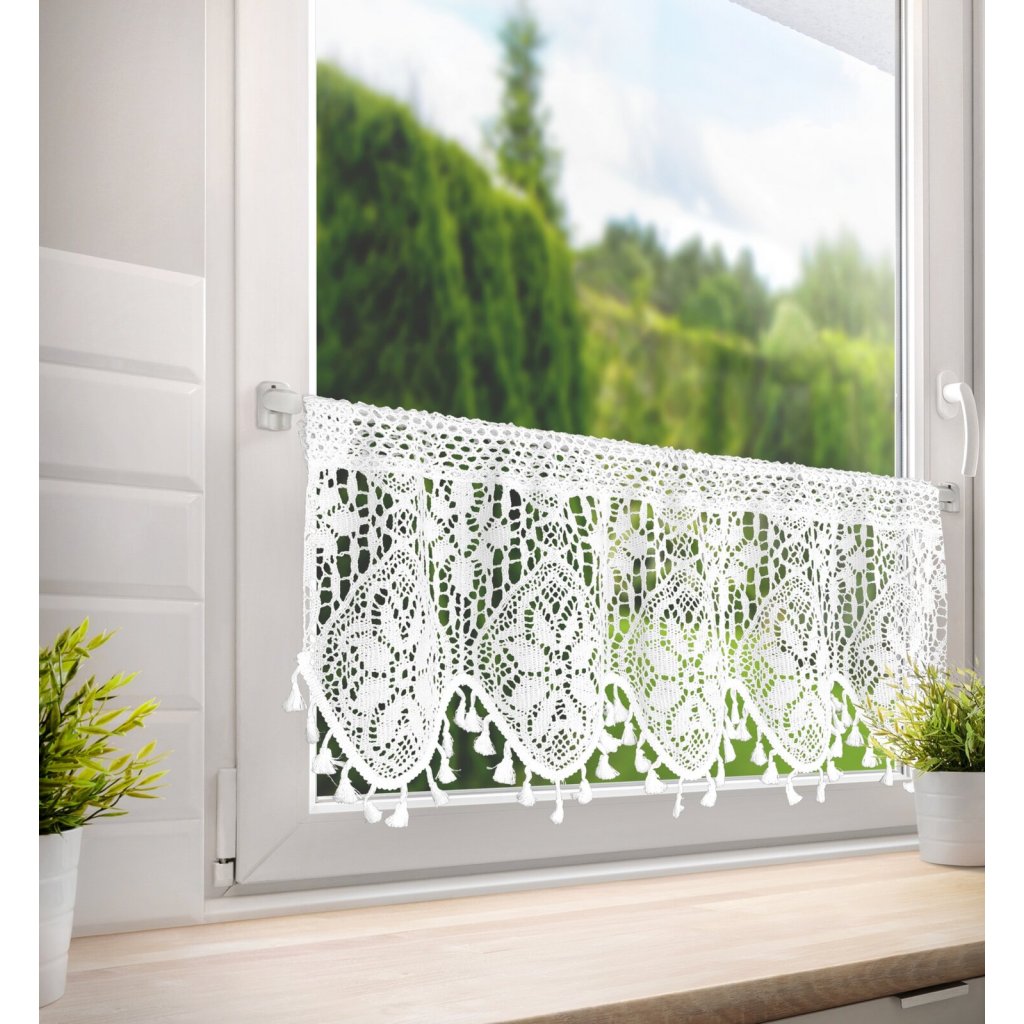 Záclona s ažurovým květinovým vzorem, šířka: 150 cm, délka: 30 cm, barva: bílá, gramáž: 150 GSM, složení: 60% bavlna, 40% polyester.Doplňkové parametry