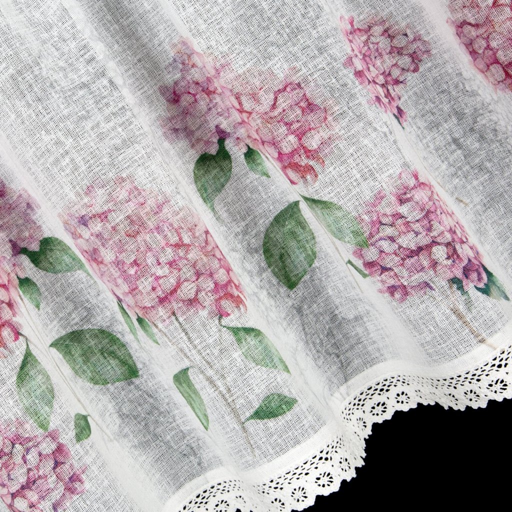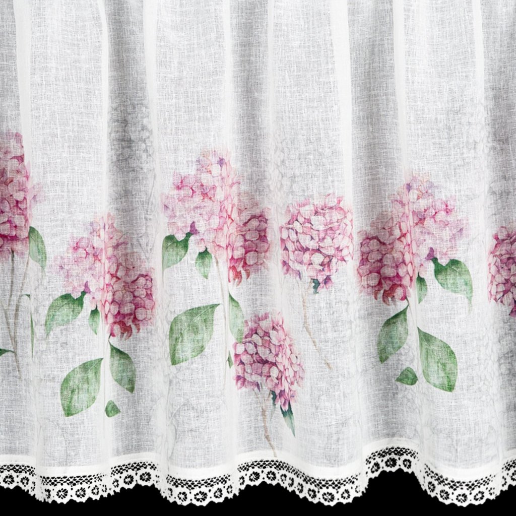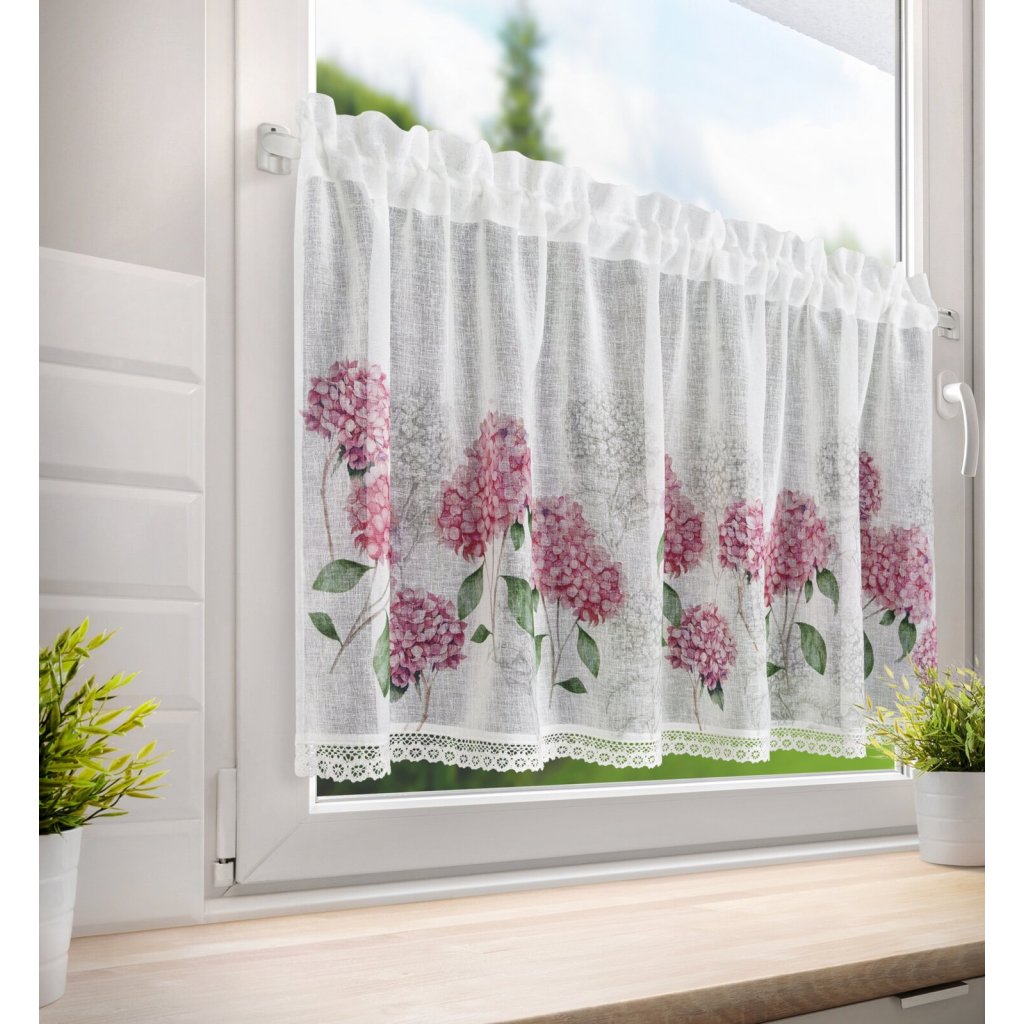Záclona s potiskem zdobená krajkou. Šířka: 150 cm, délka: 60 cm, barva: růžová/bílá, hmotnost: 110 GSM, složení: 100 % polyesterDoplňkové parametry