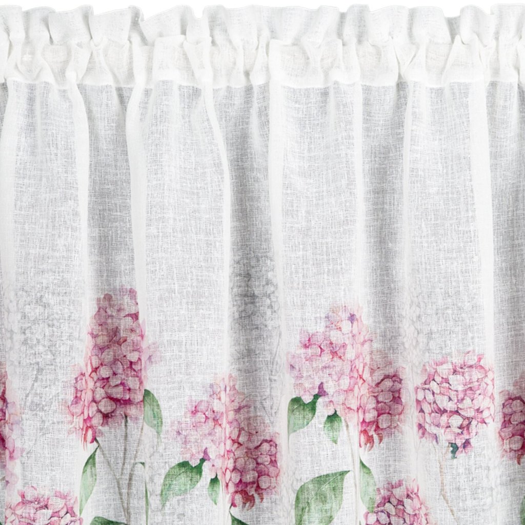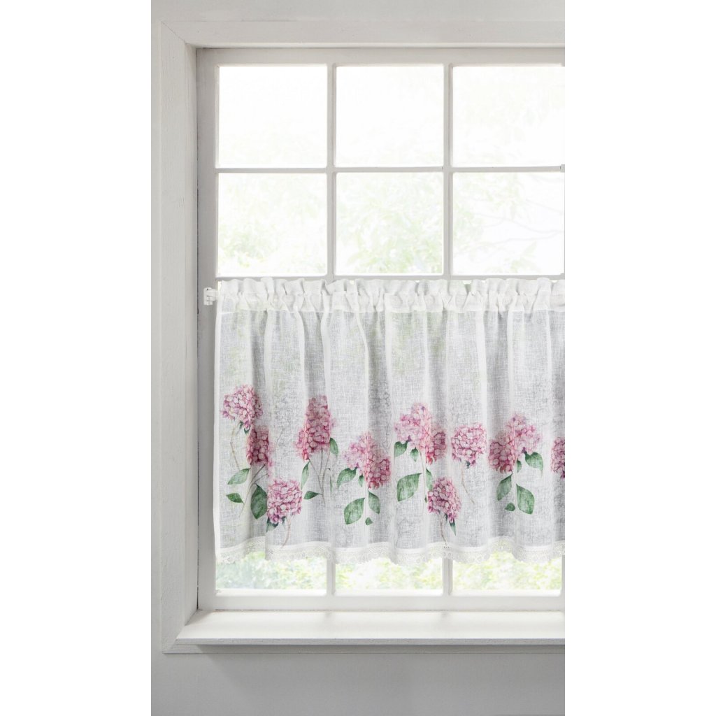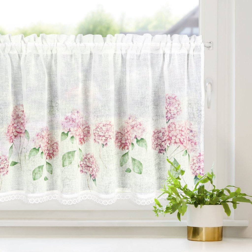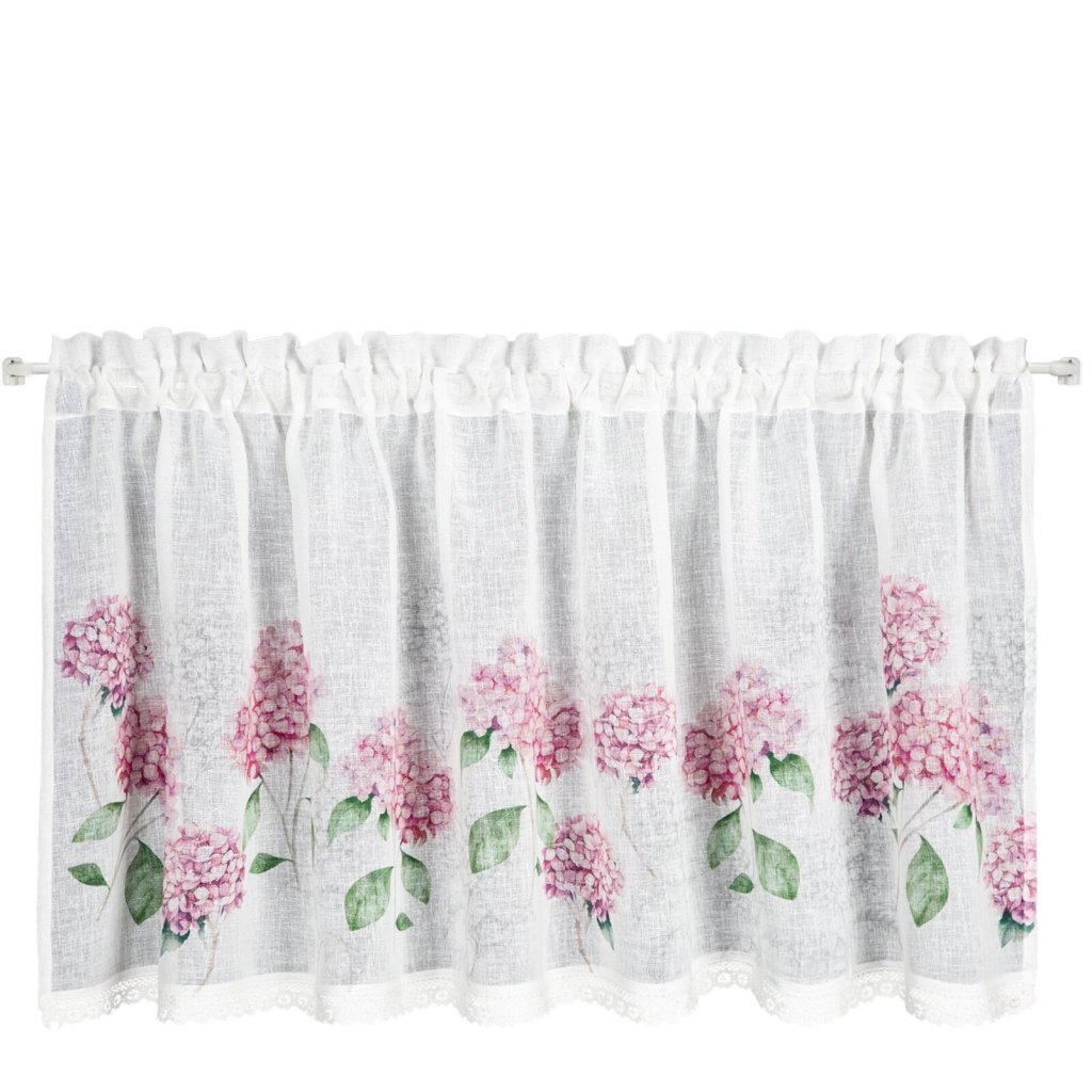 Záclona s potiskem zdobená krajkou. Šířka: 150 cm, délka: 60 cm, barva: růžová/bílá, hmotnost: 110 GSM, složení: 100 % polyesterDoplňkové parametry