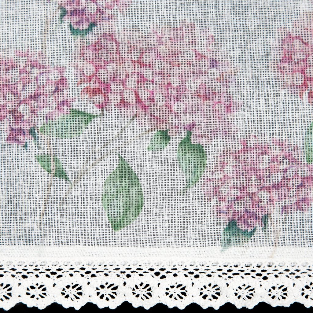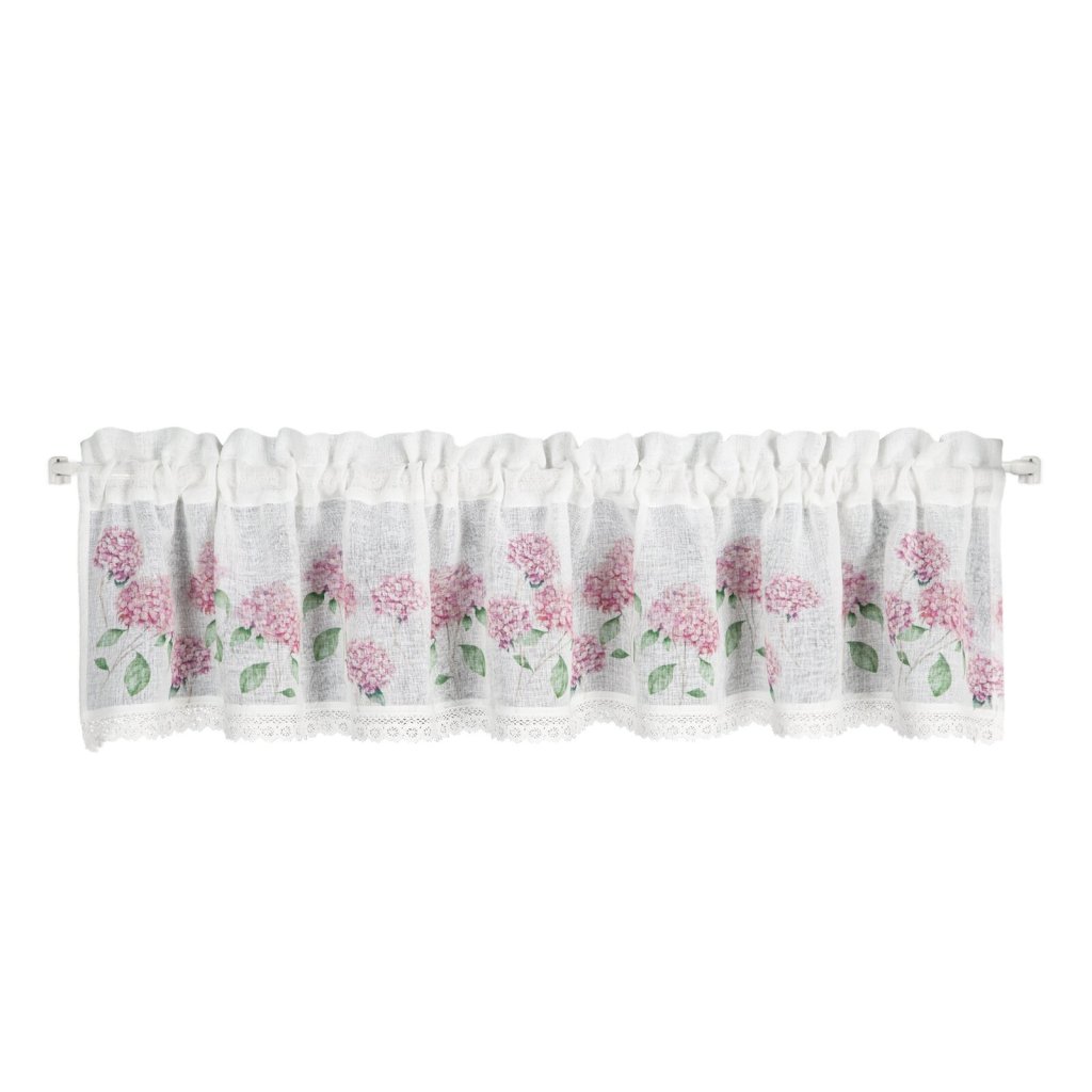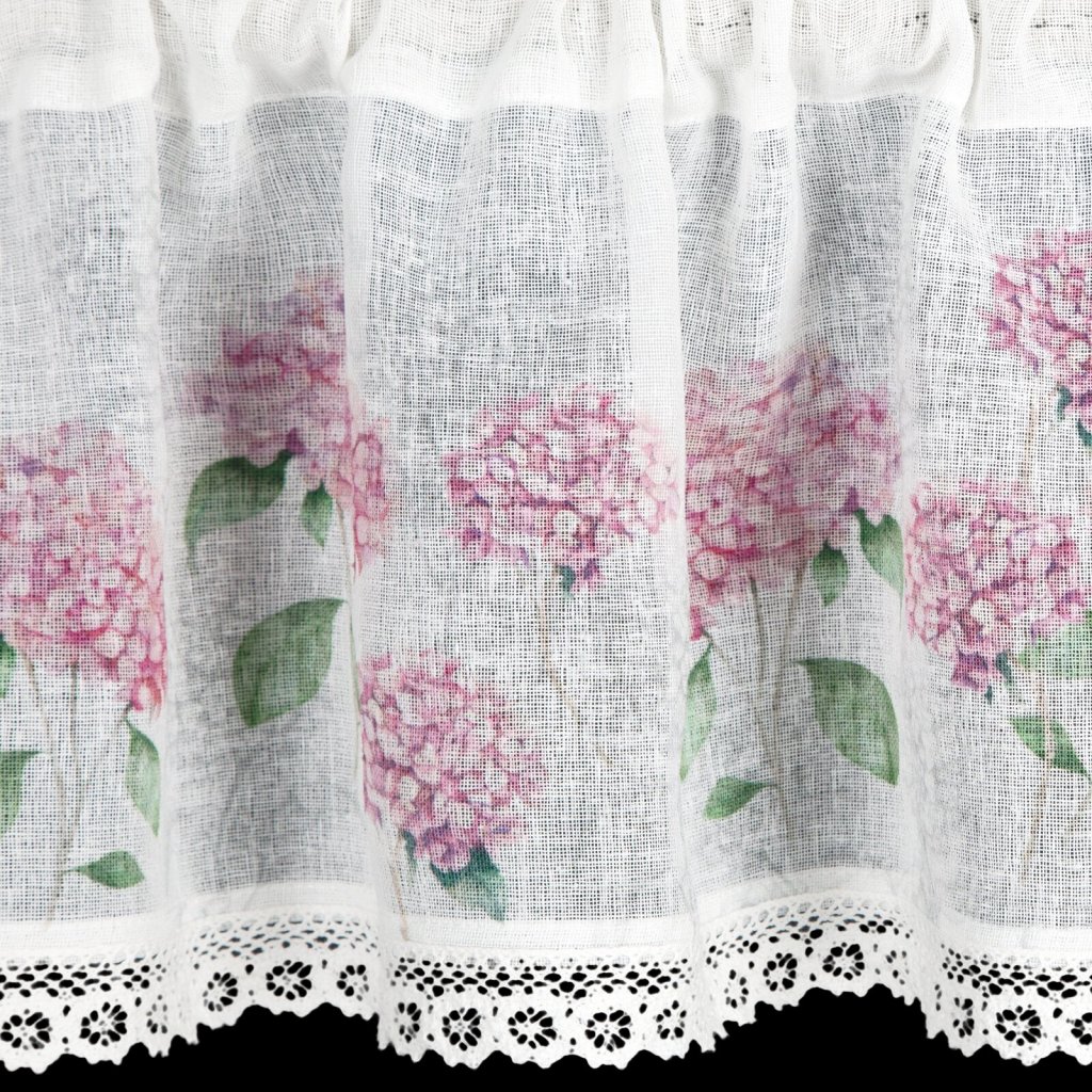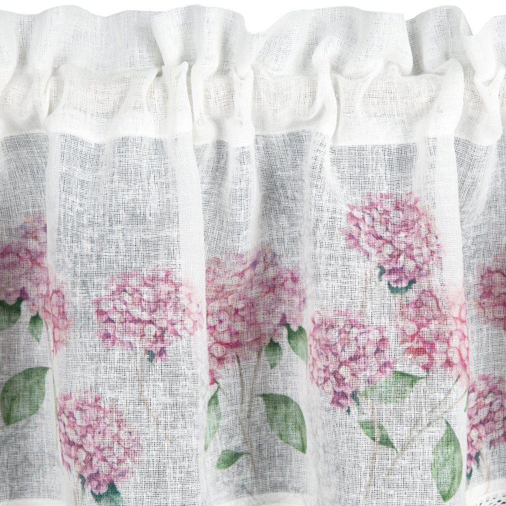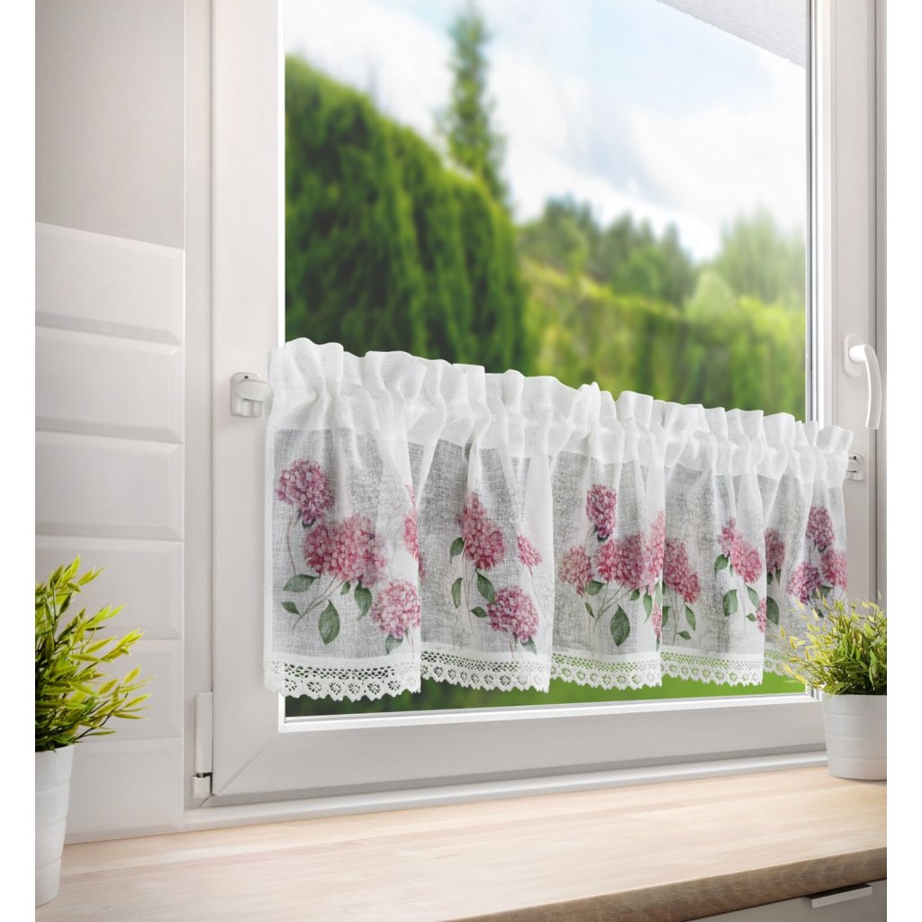 Záclona s potiskem zdobená krajkou. Šířka: 150 cm, délka: 30 cm, barva: růžová/bílá, hmotnost: 110 GSM, složení: 100 % polyesterDoplňkové parametry