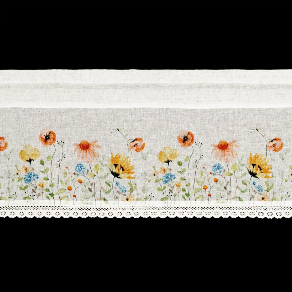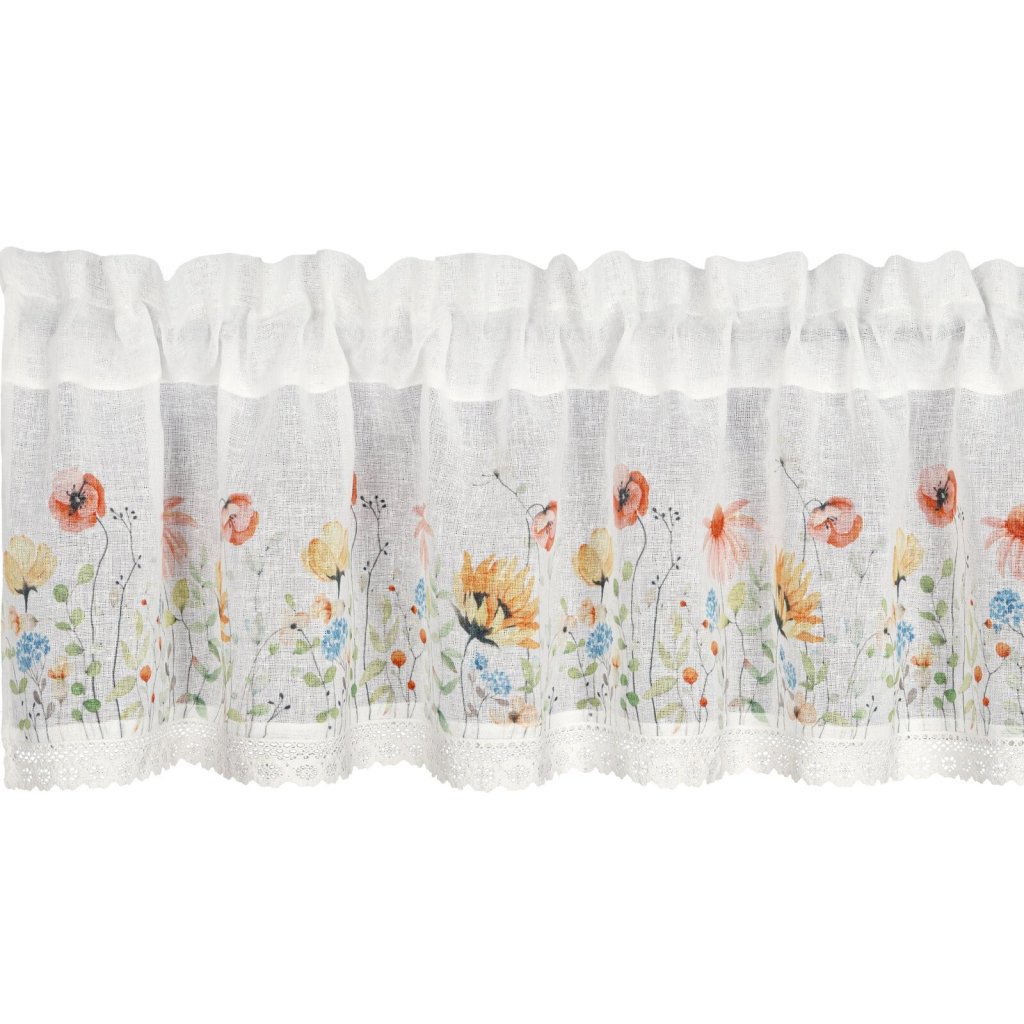 Gázová záclona zdobená potiskem letních květin je půvabnou dekorací, která vnese do interiéru svěží, jarní atmosféru. Celek navíc doplňuje decentní krajka všitá ve spodní části látky, která dodává elegantní a romantický charakter. Šířka: 150 cm, délka: 30 cm, barva: vícebarevná, hmotnost: 110 GSM, složení: 100% polyester.Doplňkové parametry