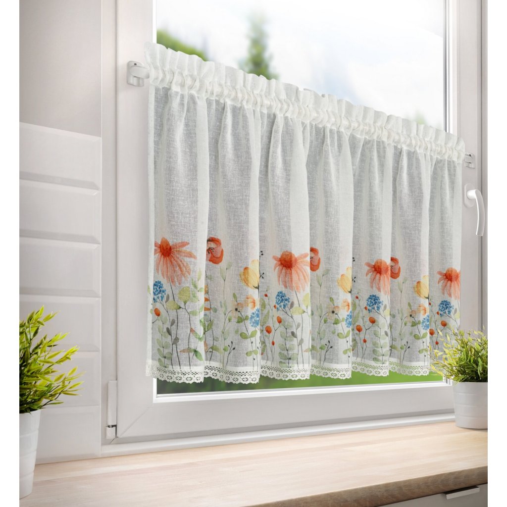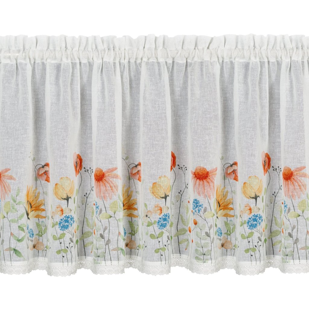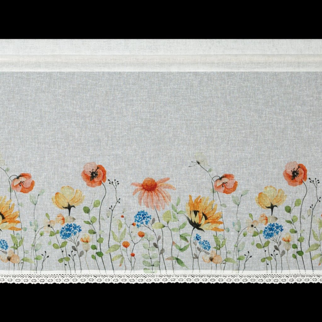 Gázová záclona zdobená potiskem letních květin je půvabnou dekorací, která vnese do interiéru svěží, jarní atmosféru. Celek navíc doplňuje decentní krajka všitá ve spodní části látky, která dodává elegantní a romantický charakter. Šířka: 150 cm, délka: 60 cm, barva: vícebarevná, hmotnost: 110 GSM, složení: 100% polyester.Doplňkové parametry