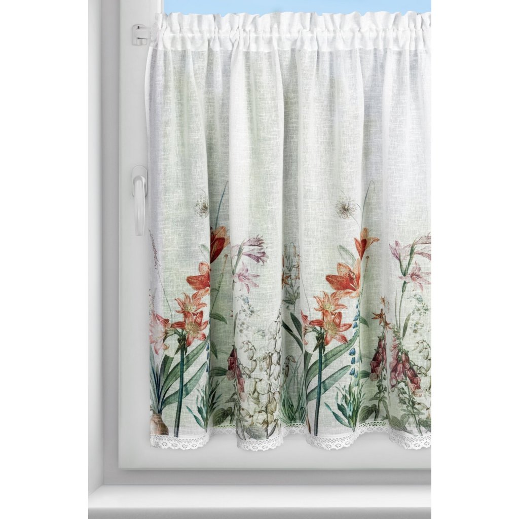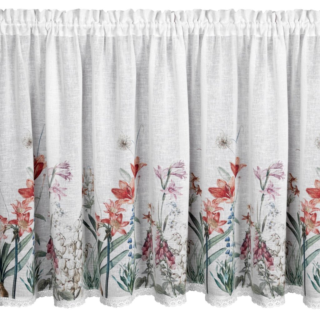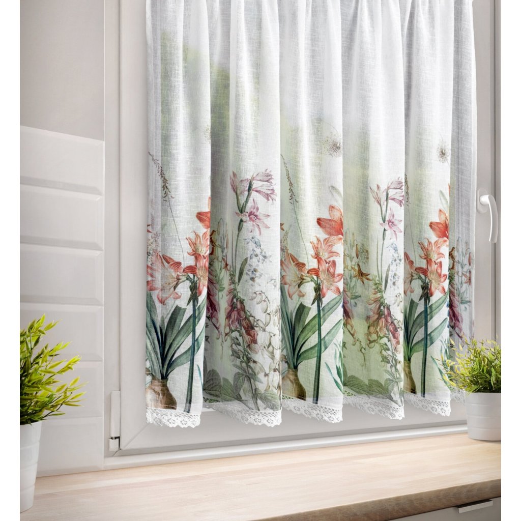 Dodejte svému interiéru jemný, romantický nádech s touto elegantní záclonou NEMEZJA s barevným potiskem lučních květů. Vzdušný bílý základ působí lehce a přirozeně, zatímco bohatý květinový vzor vytváří dojem rozkvetlé louky. Jemná krajka podél spodního okraje dodává zácloně tradiční půvab. Šířka: 150 cm, délka: 90 cm, barva: vícebarevná, hmotnost: 150 GSM, složení: 100% polyester.Doplňkové parametry