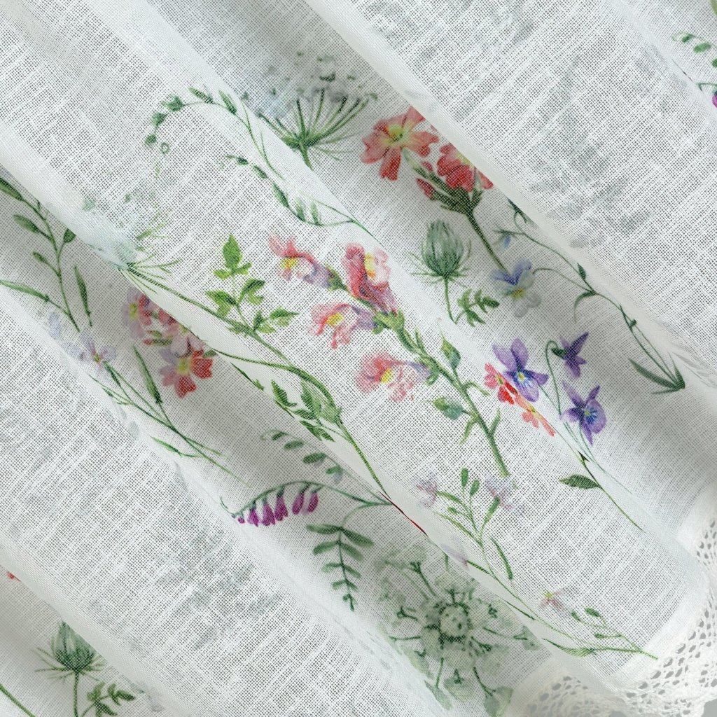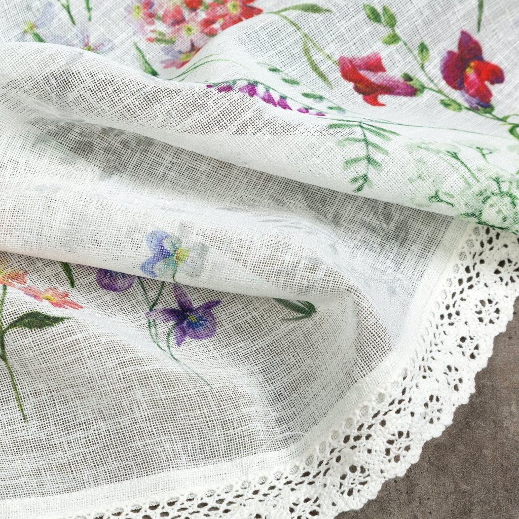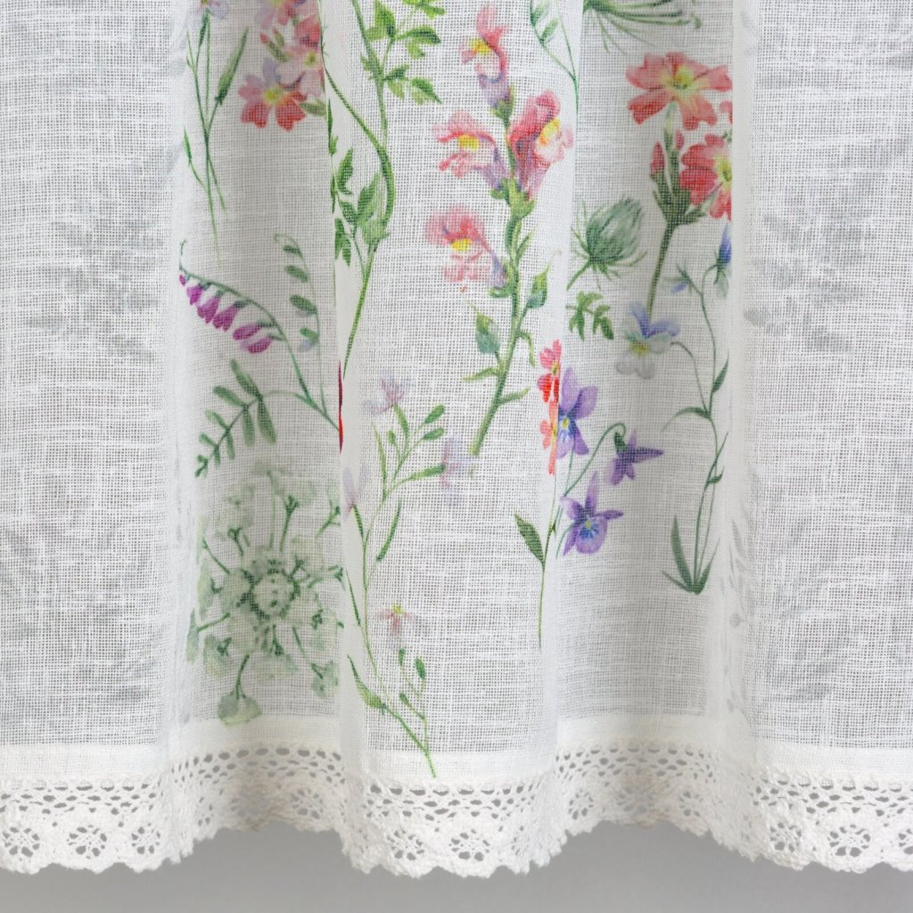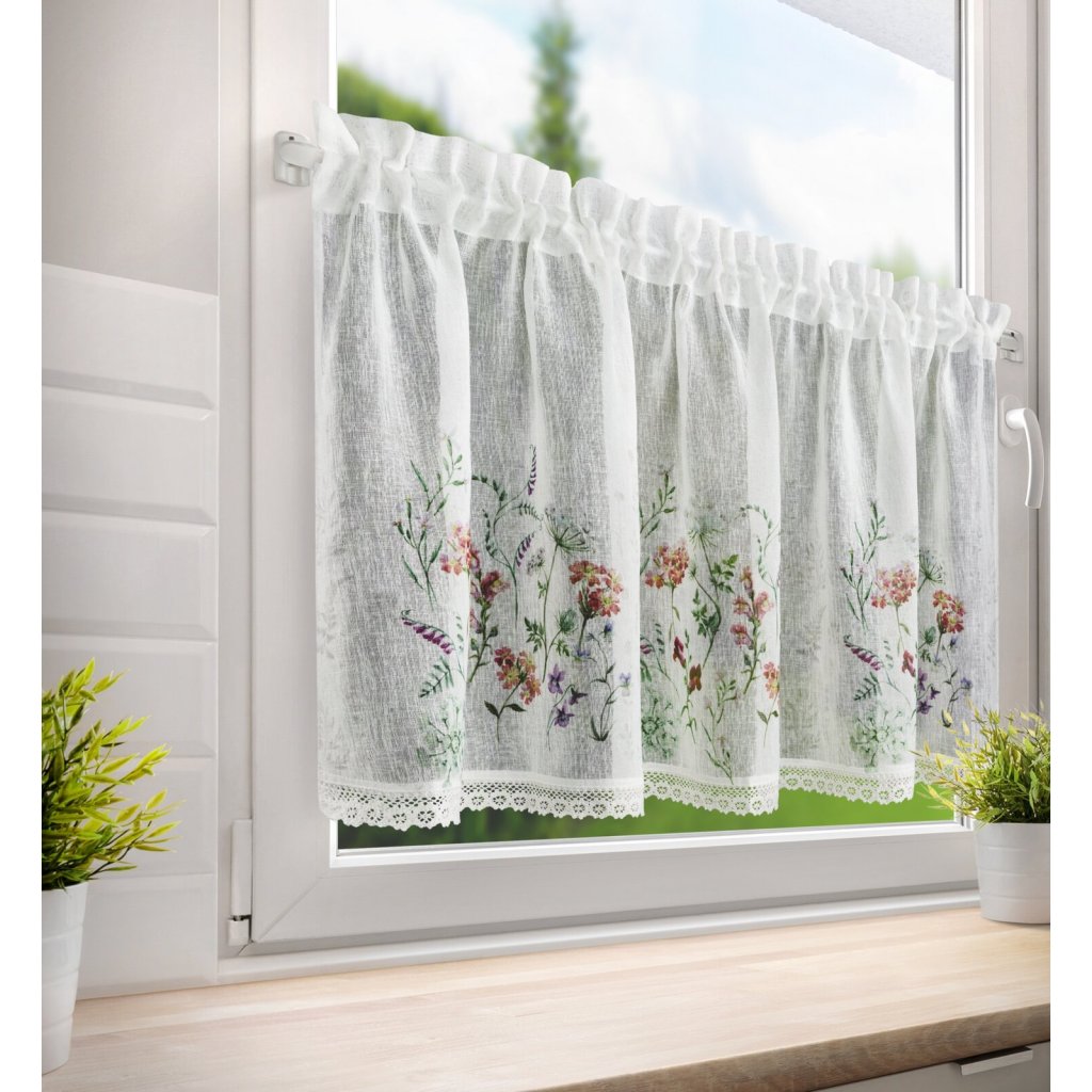 Záclona s potiskem zdobená krajkou. Šířka: 150 cm, délka: 60 cm, barva: vícebarevná, hmotnost: 110 GSM, složení: 100% polyester.Doplňkové parametry