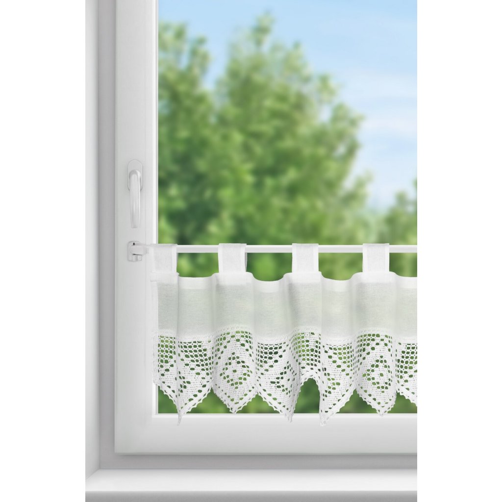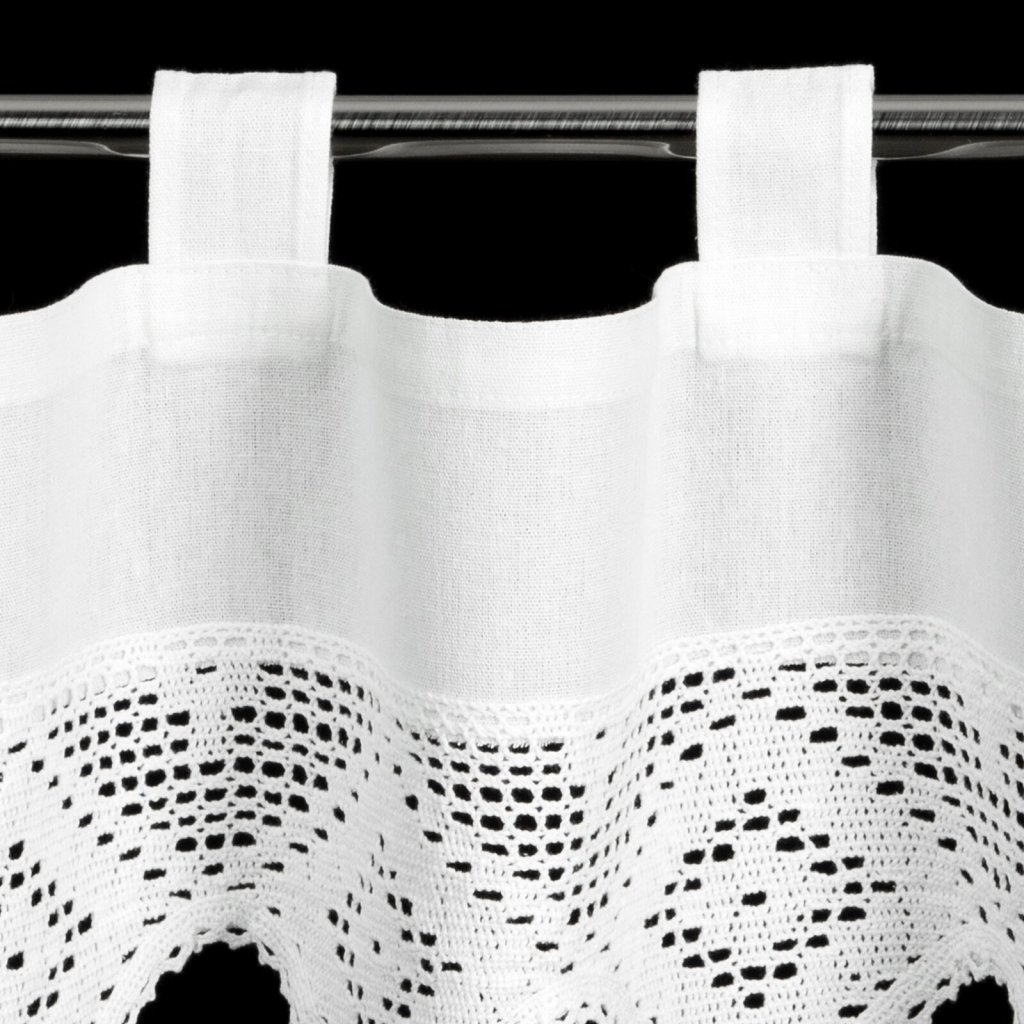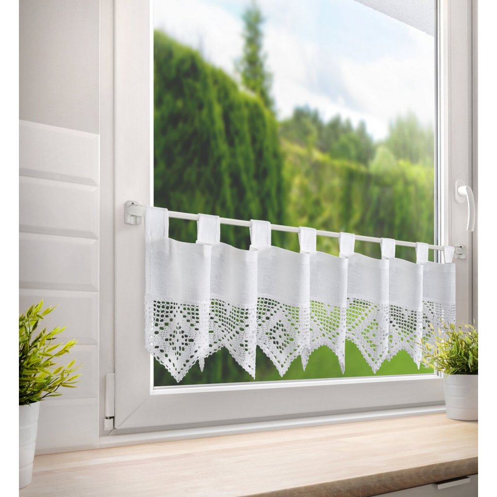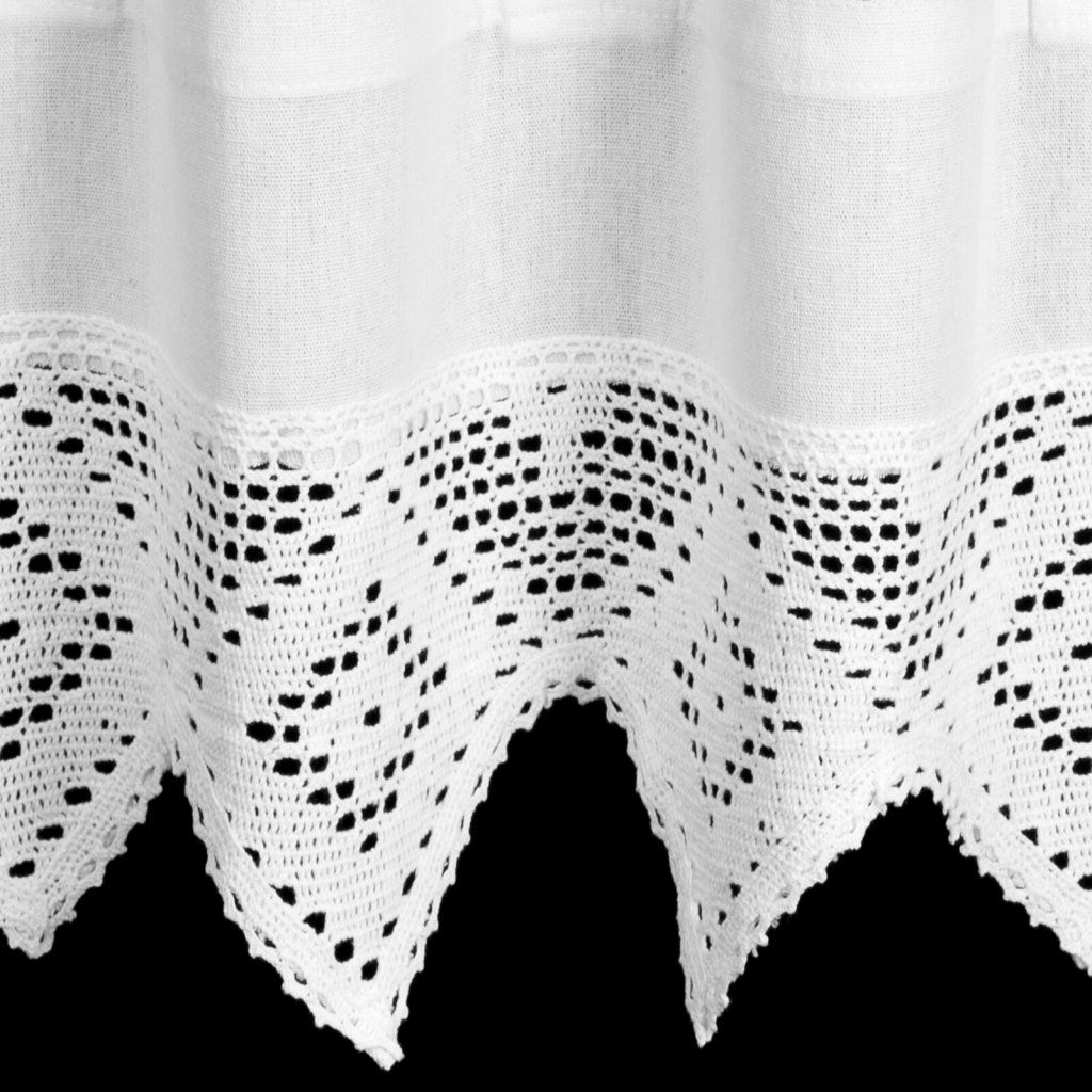 Záclona zdobená krajkou. Šířka: 150 cm, délka: 30 cm, barva: bílá, hmotnost: 180 GSM, složení: 60% bavlna 40% polyesterDoplňkové parametry