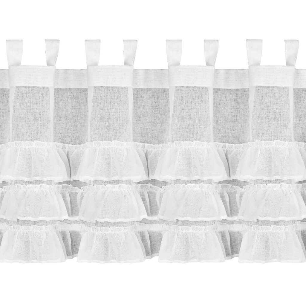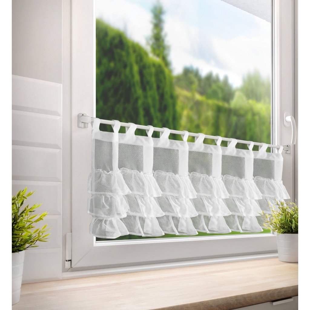 Hotová záclona zdobená volánky, šířka: 150 cm, délka: 70 cm, barva: bílá, hmotnost. 70 GSM, složení: 100% polyester.Doplňkové parametry