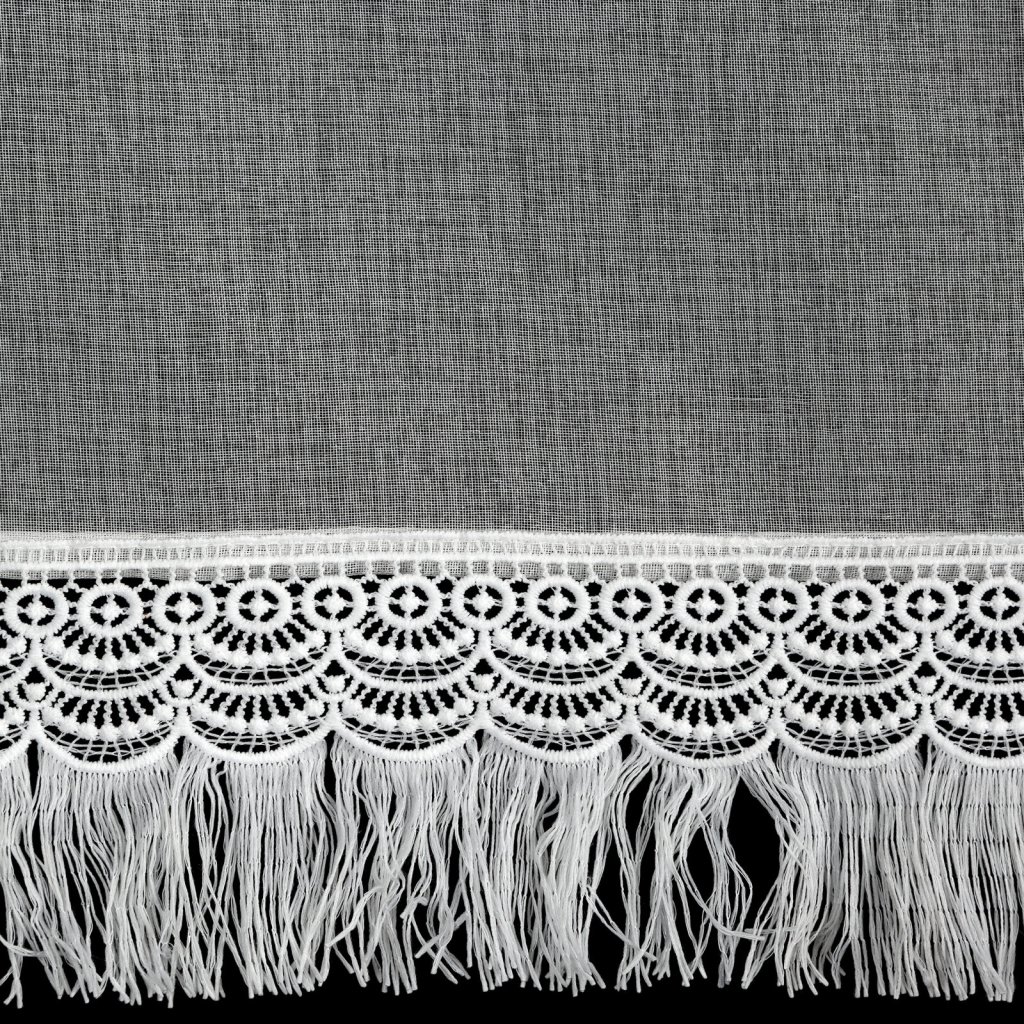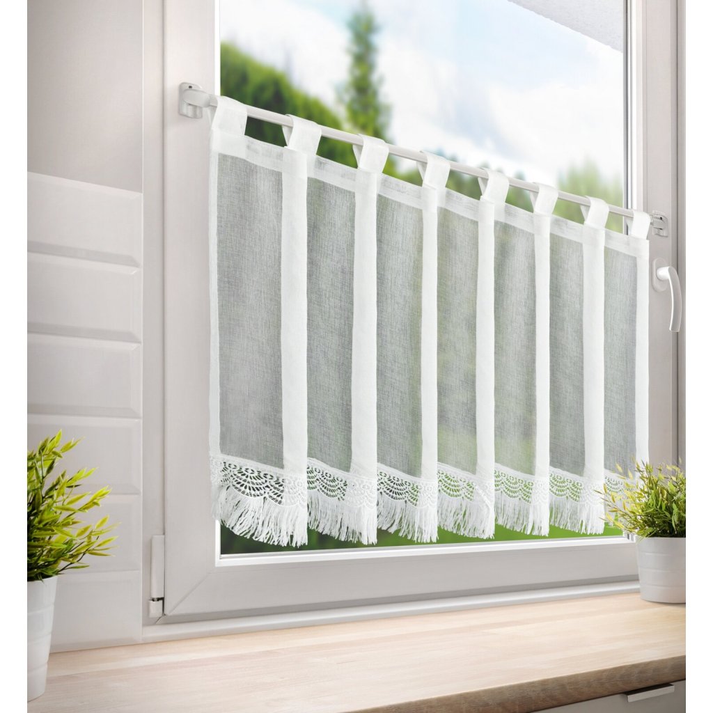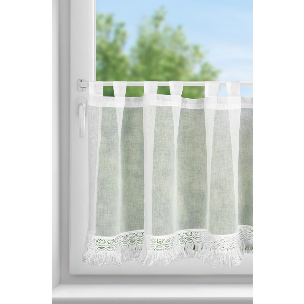 Hotová krátká záclona s ozdobným lemem, šířka: 60 cm, délka: 150 cm, barva: bílá, složení: 100% polyester.Doplňkové parametry