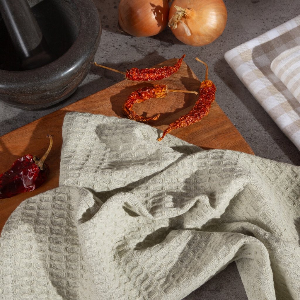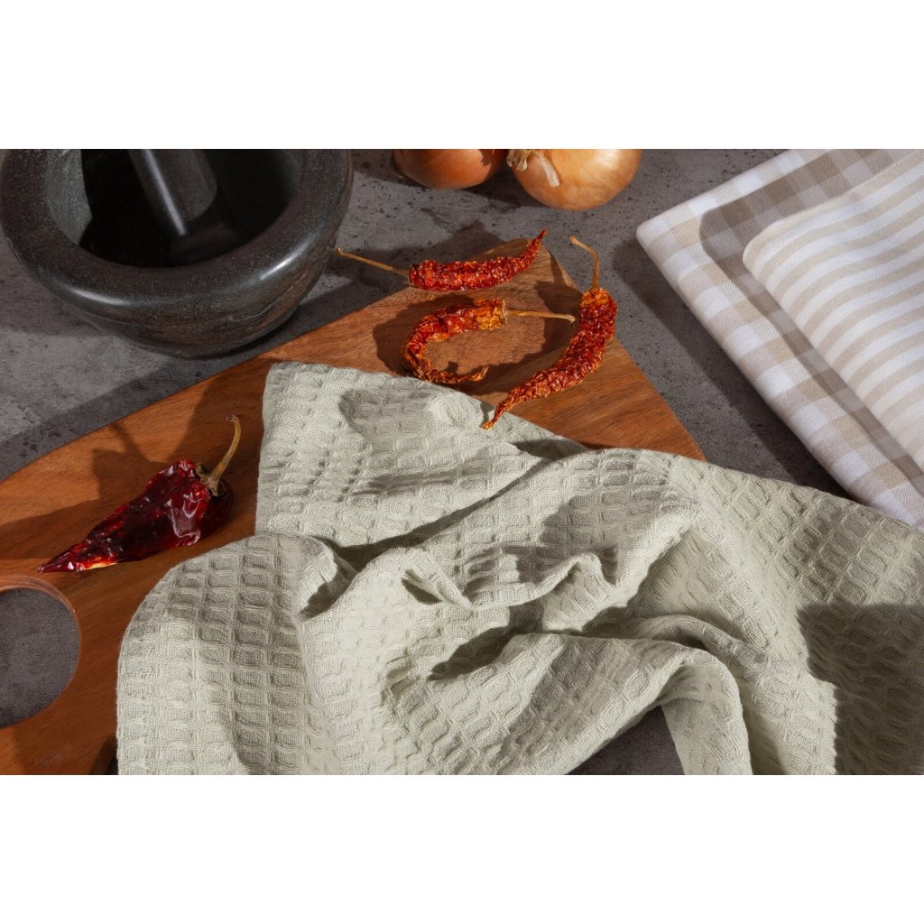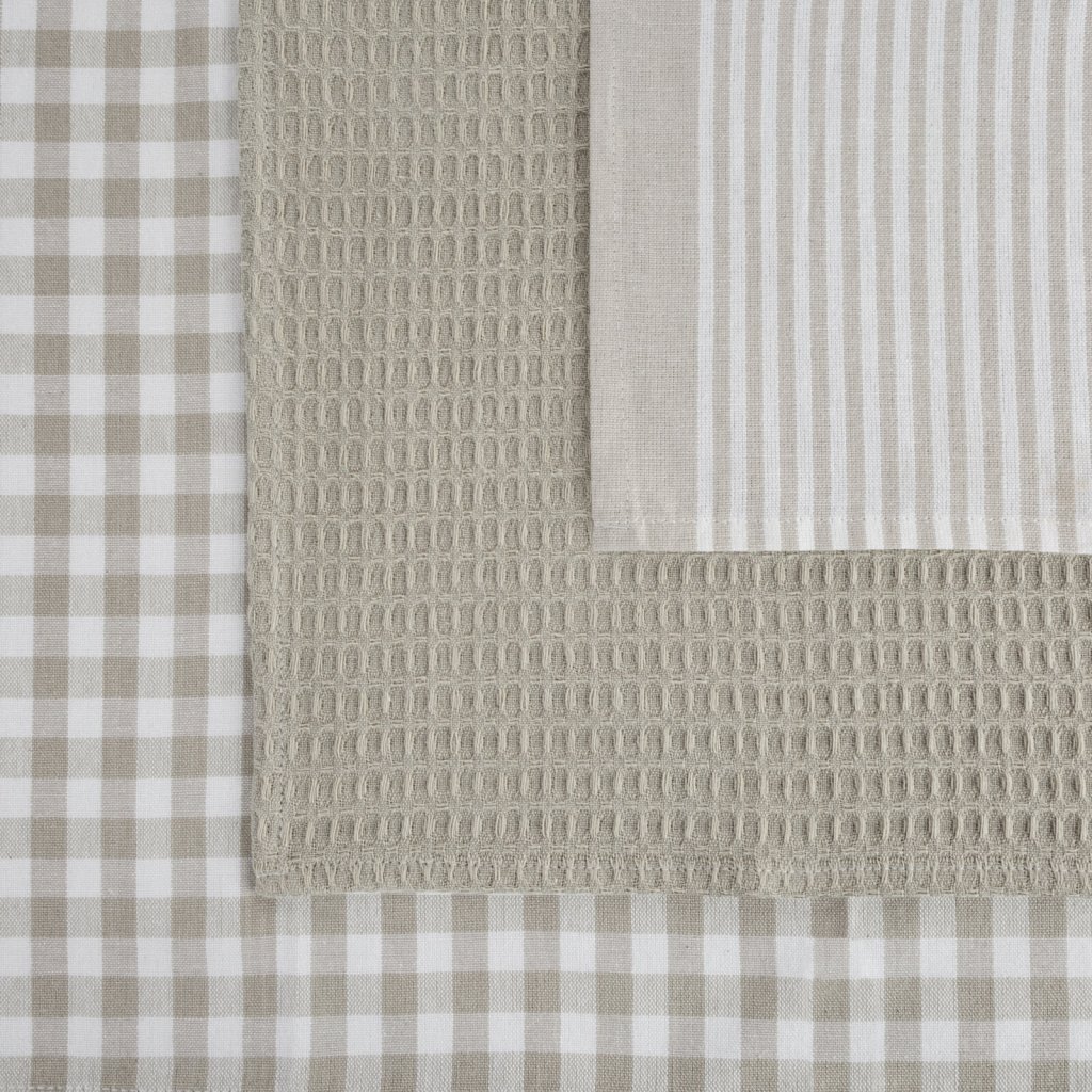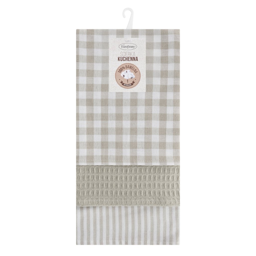 Praktická sada kuchyňských utěrek LUCY je dokonalou kombinací funkčnosti a estetiky. Jsou vyrobeny ze 100% bavlny, jsou savé, odolné a ideální pro každodenní použití. Každá utěrka v sadě má jiný vzor, což umožňuje jejich různé použití, první je s klasickým mřížkovým vzorem, druhá je hladká s vaflovou strukturou, třetí má pruhy. V sadě jsou 3 utěrky ve třech různých vzorech. Šířka: 50 cm, délka: 70 cm, barva: béžová a bílá, gramáž: 200 GSM, složení: 100% bavlna.Doplňkové parametry