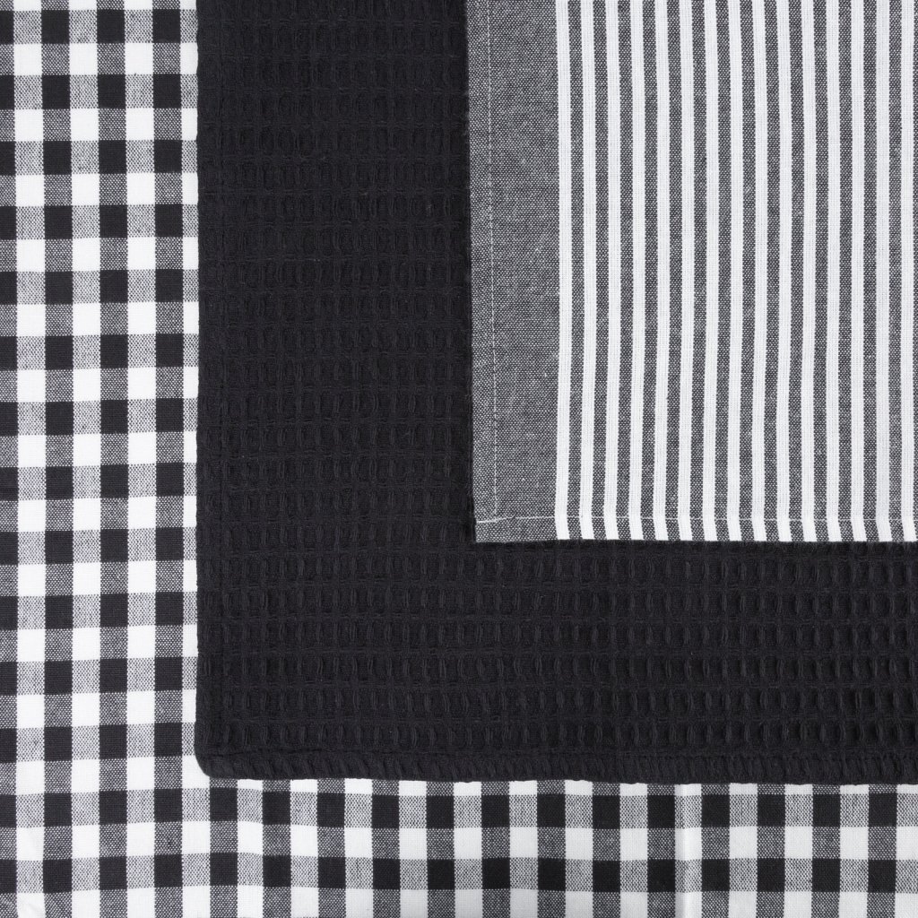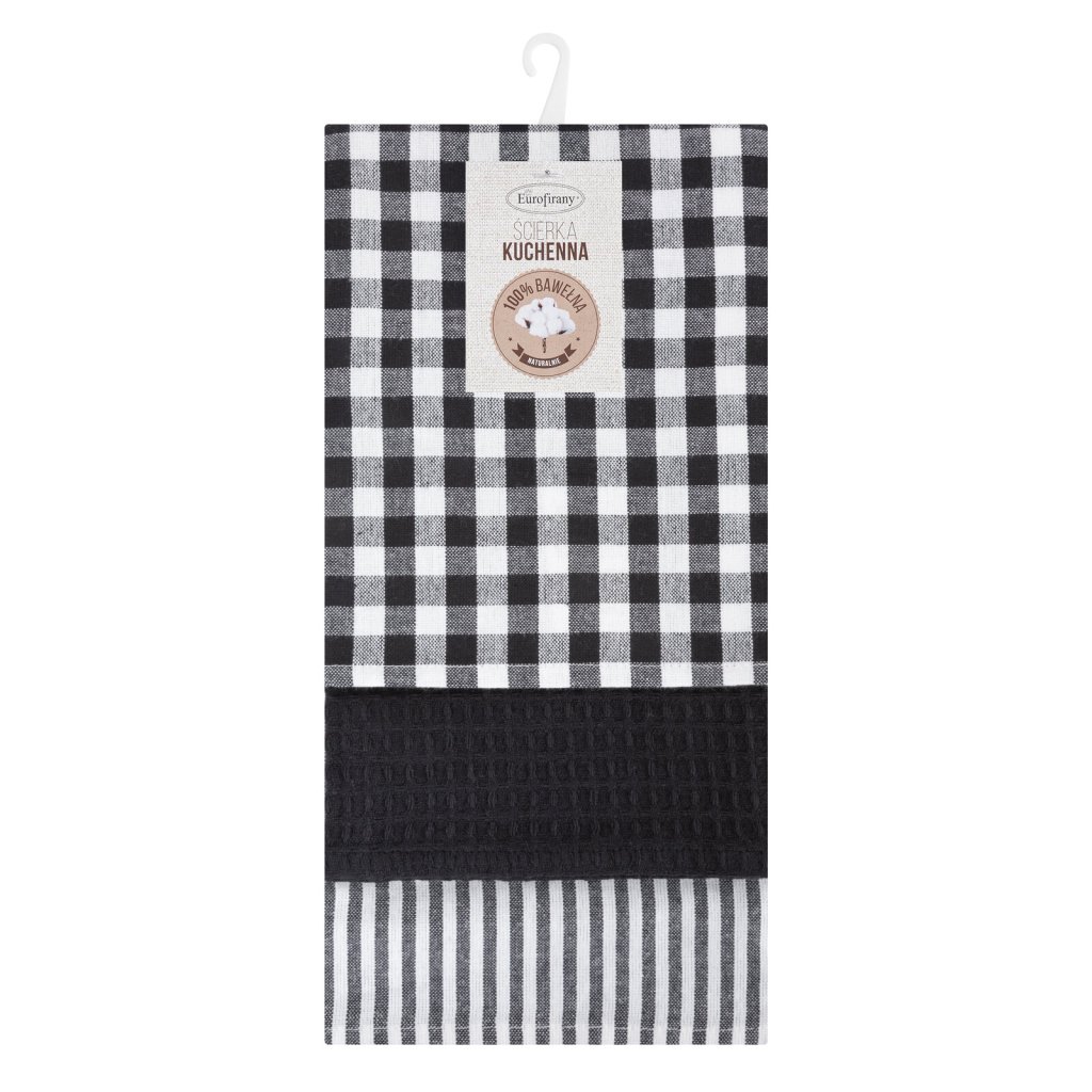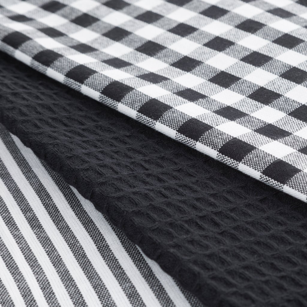 Praktická sada kuchyňských utěrek LUCY je dokonalou kombinací funkčnosti a estetiky. Jsou vyrobeny ze 100% bavlny, jsou savé, odolné a ideální pro každodenní použití. Každá utěrka v sadě má jiný vzor, což umožňuje jejich různé použití, první je s klasickým mřížkovým vzorem, druhá je hladká s vaflovou strukturou, třetí má pruhy. V sadě jsou 3 utěrky ve třech různých vzorech. Šířka: 50 cm, délka: 70 cm, barva: černobílá, gramáž: 200 GSM, složení: 100% bavlna.Doplňkové parametry
