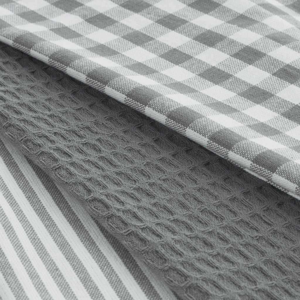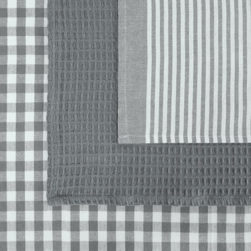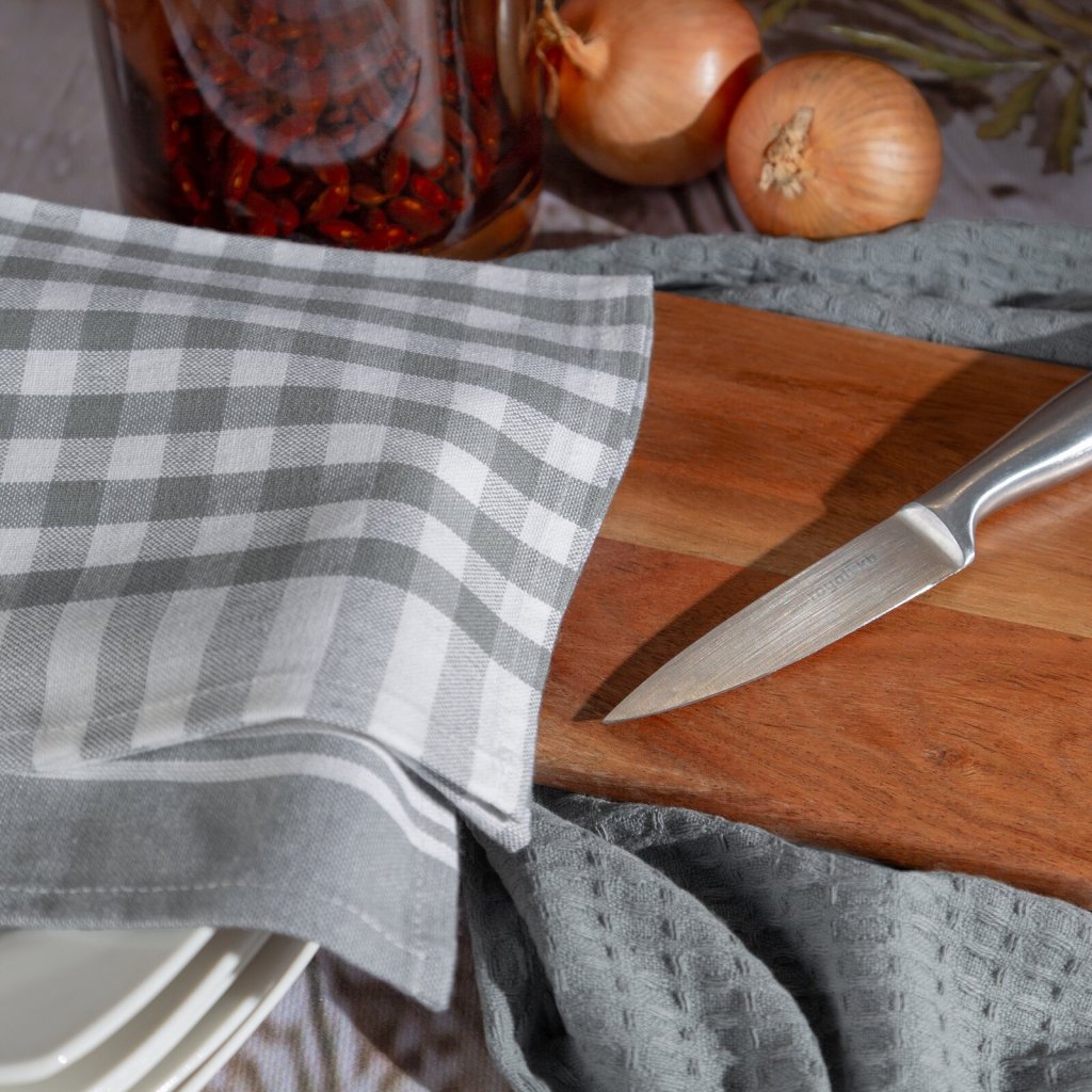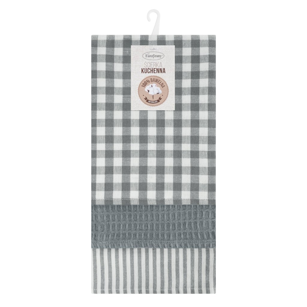 Praktická sada kuchyňských utěrek LUCY je dokonalou kombinací funkčnosti a estetiky. Jsou vyrobeny ze 100% bavlny, jsou savé, odolné a ideální pro každodenní použití. Každá utěrka v sadě má jiný vzor, což umožňuje jejich různé použití, první je s klasickým mřížkovým vzorem, druhá je hladká s vaflovou strukturou, třetí má pruhy. V sadě jsou 3 utěrky ve třech různých vzorech. Šířka: 50 cm, délka: 70 cm, barva: stříbrná a bílá, gramáž: 200 GSM, složení: 100% bavlna.Doplňkové parametry