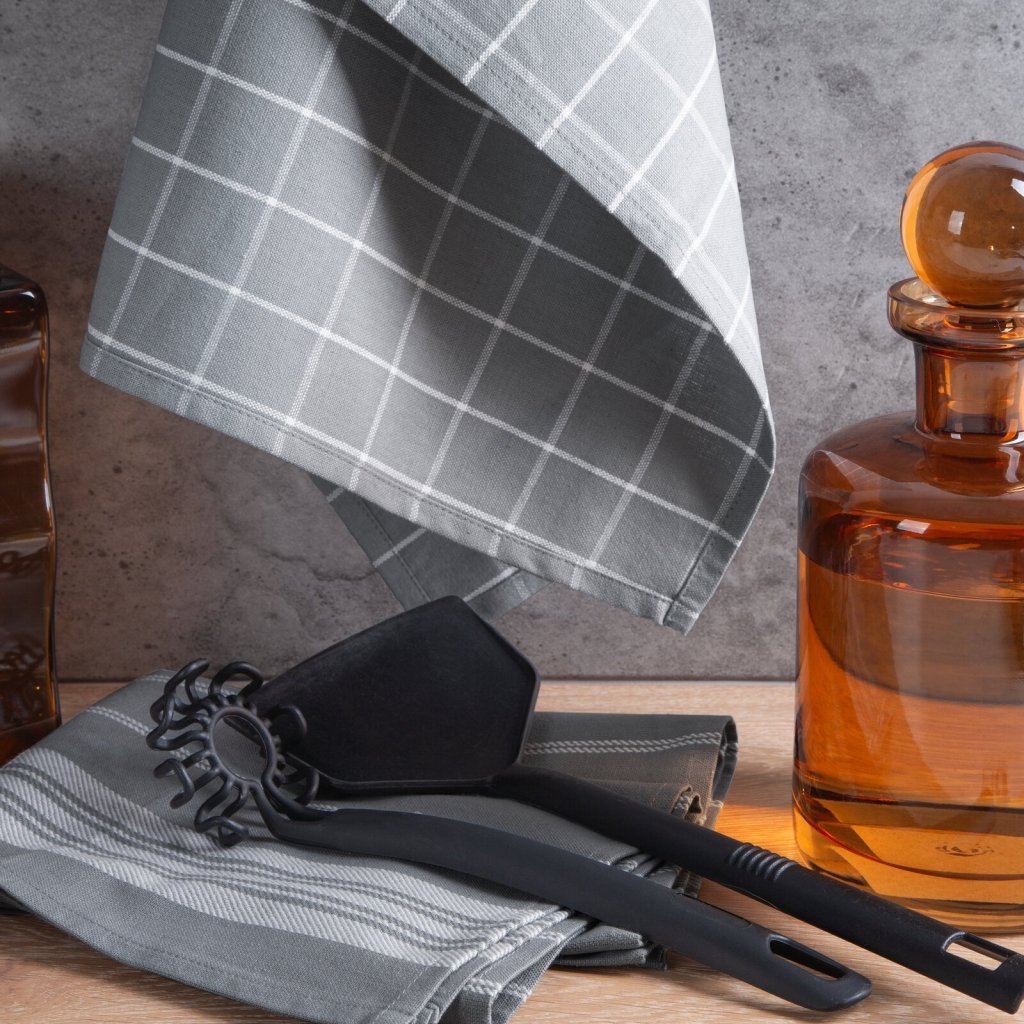 Kuchyňské utěrky RUBI jsou vyrobeny z vysoce kvalitních materiálů, které mají vynikající savost a odolnost. Kostkovaný vzor a jemné proužky dodávají ručníkům klasický šarm a hodí se k různým stylům interiérů. V sadě jsou 2 utěrky ve dvou různých provedeních. Šířka: 50 cm, délka: 70 cm, barva: stříbrná, gramáž: 200 GSM, složení: 100% bavlna.Doplňkové parametry