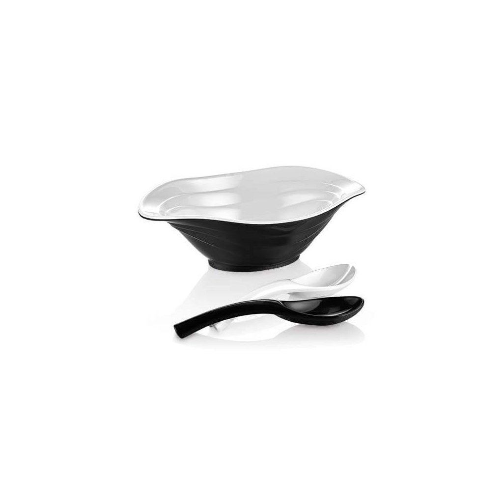 Salátová souprava Duet z melaminu v černobílé barvě.Sada obsahuje:1 x mísa 33 cm x 23 cm1 x lžíce1 x vidlička