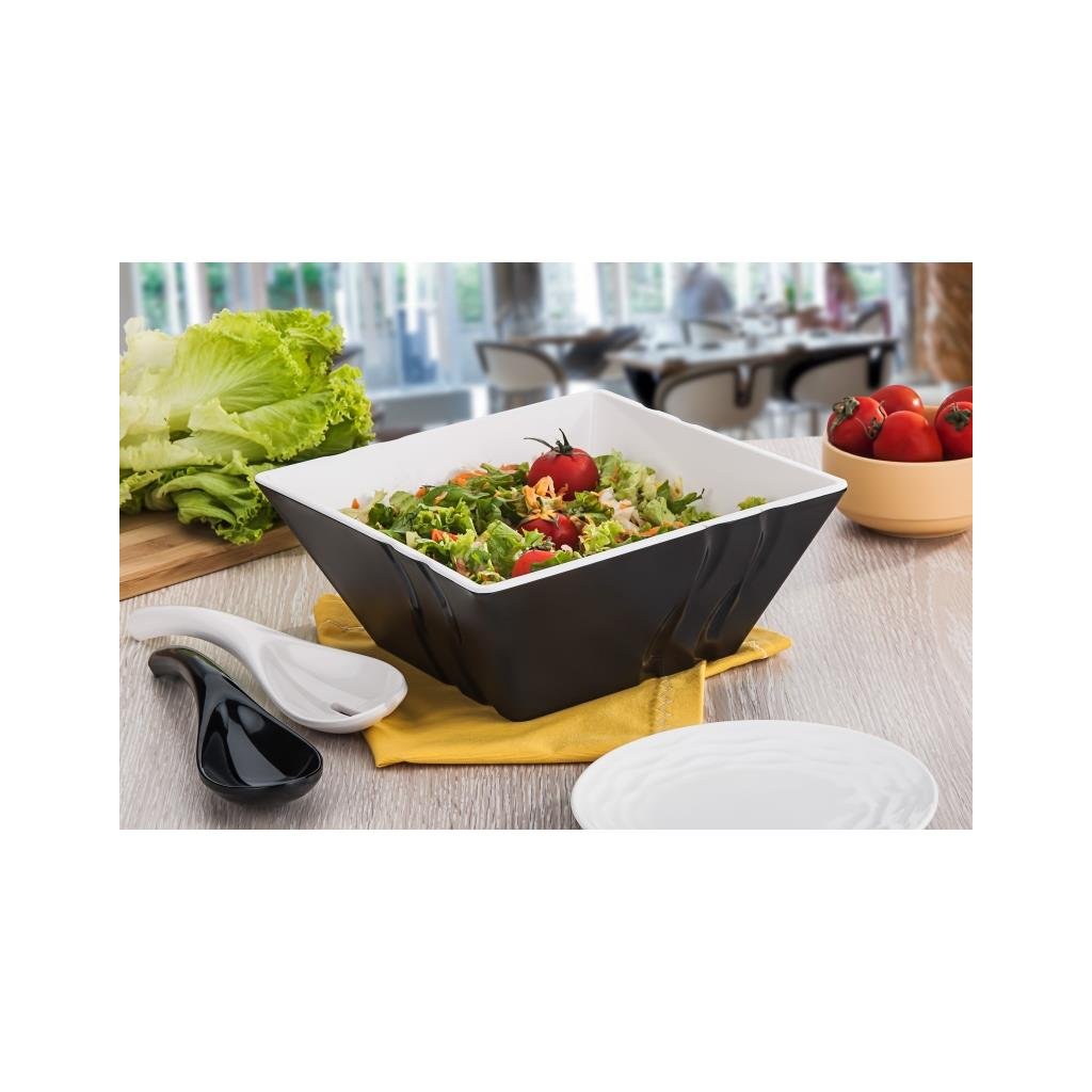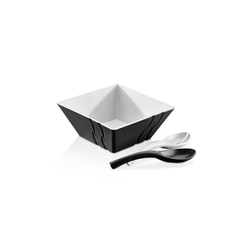Melaminové nádobí pro domácí i profesionální použití. Je odolné proti rozbití, bezpečné a hygienické a zároveň velmi praktické a estetické. Výrobky lze mýt v myčce nádobí.Sada na salát v černobílé barvě obsahuje:1 x mísa 24 cm x 24 cm1 x lžíce1 x vidlička