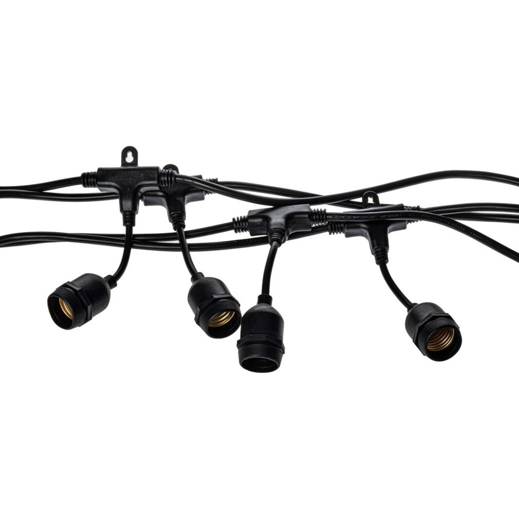 LED světelný řetěz Basic o délce 10 metrů je vybaven 10 objímkami typu E27 , které jsou připraveny k osazení vyměnitelných LED žárovek (žárovky nejsou součástí balení). Řetěz je vyroben z odolného plastu v černé barvě, má šířku 35 mm, výšku 60 mm a hmotnost 2 kg. Díky stupni ochrany IP44 je voděodolná a chráněná před prachem , což ji předurčuje pro bezpečné venkovní použití.