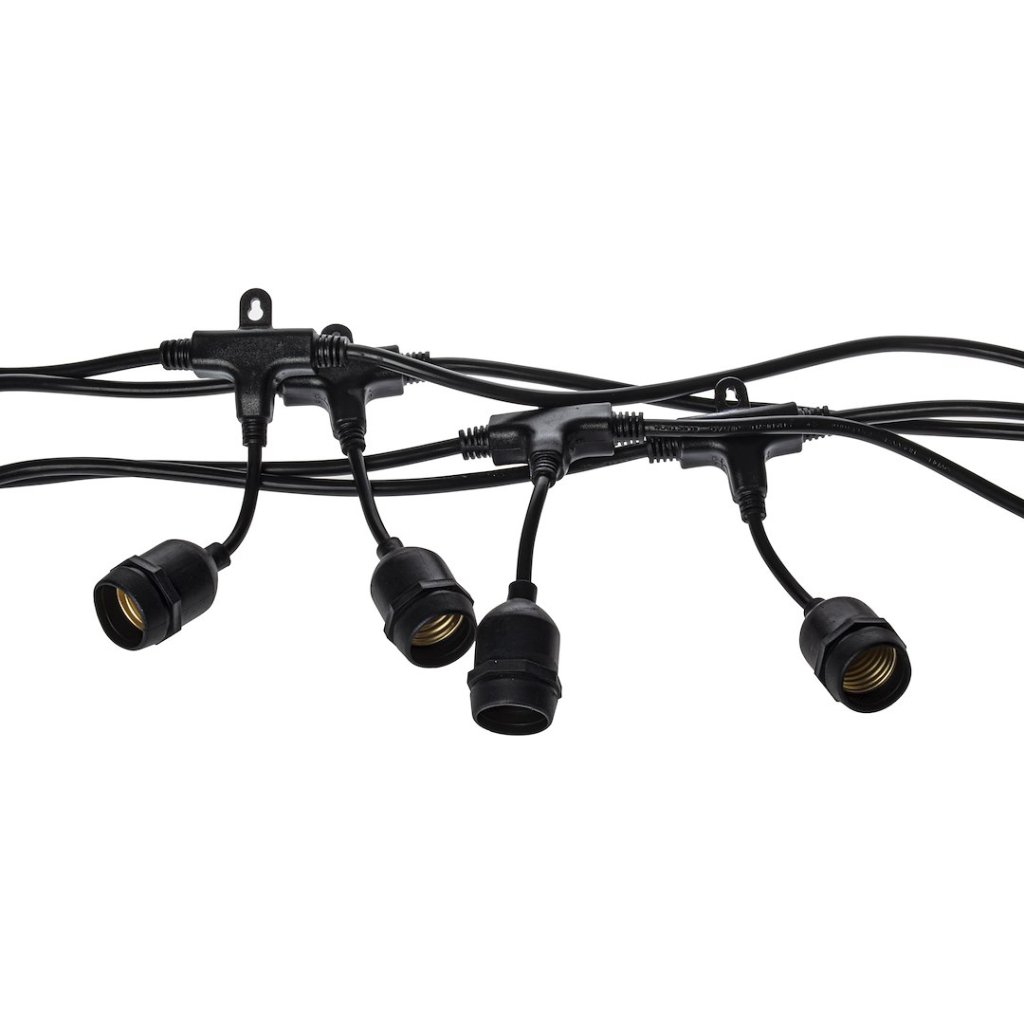 Každá objímka je voděodolná a chráněná před prachem díky stupni ochrany IP44 , což z ní činí spolehlivý prvek pro venkovní osvětlení . Model je zároveň vybaven koncovým konektorem , který umožňuje snadné propojení dalšího světelného řetězu bez nutnosti složité instalace.