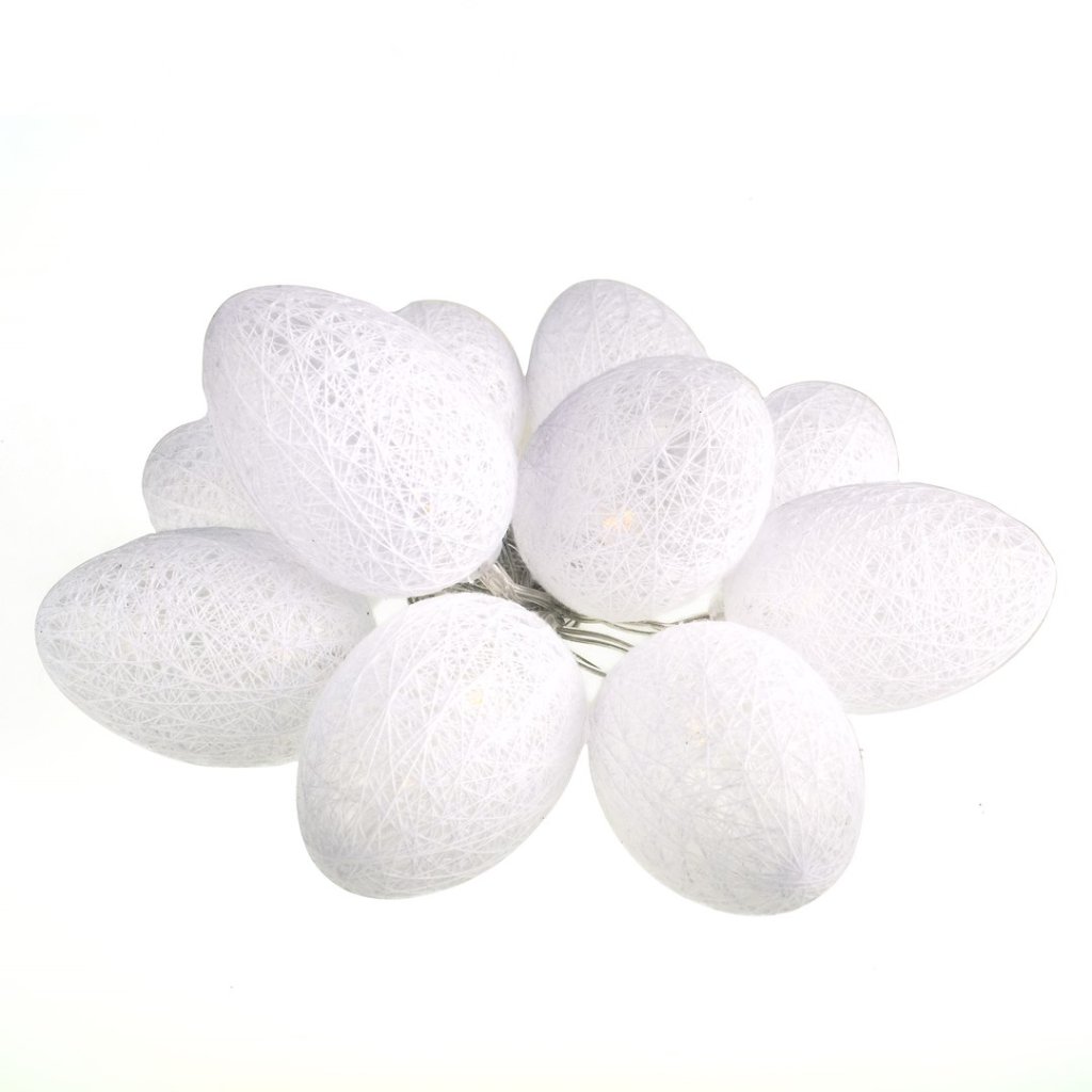 LED světelný řetěz Eggs v bílé barvě je vkusným doplňkem pro dotvoření sezónní atmosféry v interiéru. Obsahuje deset dekorativních vajíček o rozměrech přibližně 6 x 4 cm, které jsou obaleny jemnou bavlněnou nití. Vajíčka jsou rozmístěna na průhledném kabelu s rozestupem 15 cm. Celková délka řetězu je 1,6 metru, přičemž vzdálenost od pouzdra na baterie je 26 cm. Napájení zajišťují dvě baterie typu AA (nejsou součástí balení). Produkt je balen v průhledném PVC obalu.