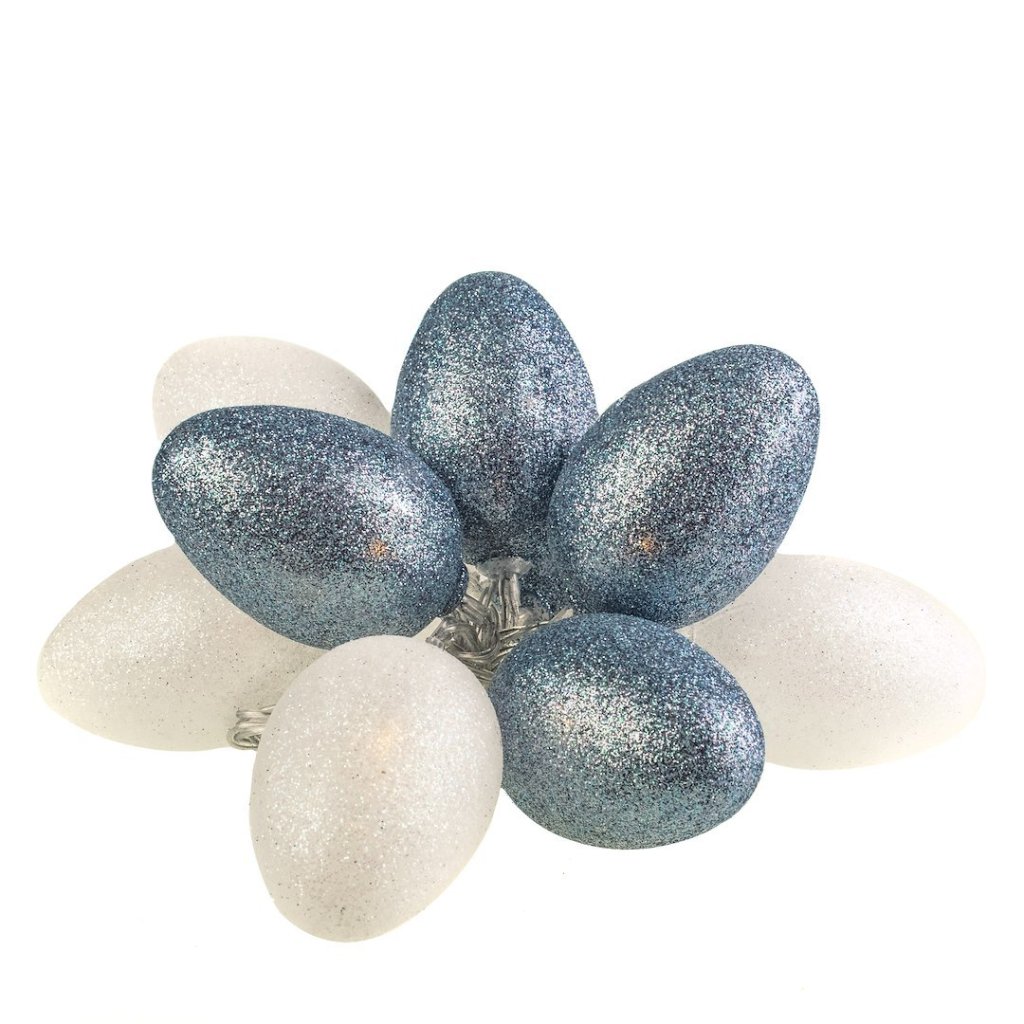 LED světelný řetěz Eggs1 v šedobílé barevné kombinaci je elegantní světelnou dekorací pro interiér. Obsahuje deset vajíček s LED osvětlením v odstínech šedé a bílé, každé o rozměrech přibližně 6 x 4 cm. Povrch vajíček je posypán jemnými třpytkami , které vytvářejí jemný lesk (barevné provedení odpovídá fotografii nebo jde o kombinaci bílé s šedou). Všechny prvky jsou umístěny na průhledném kabelu s rozestupem 15 cm, ideální pro vytvoření tlumeného a útulného sezónního osvětlení .