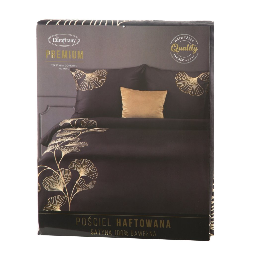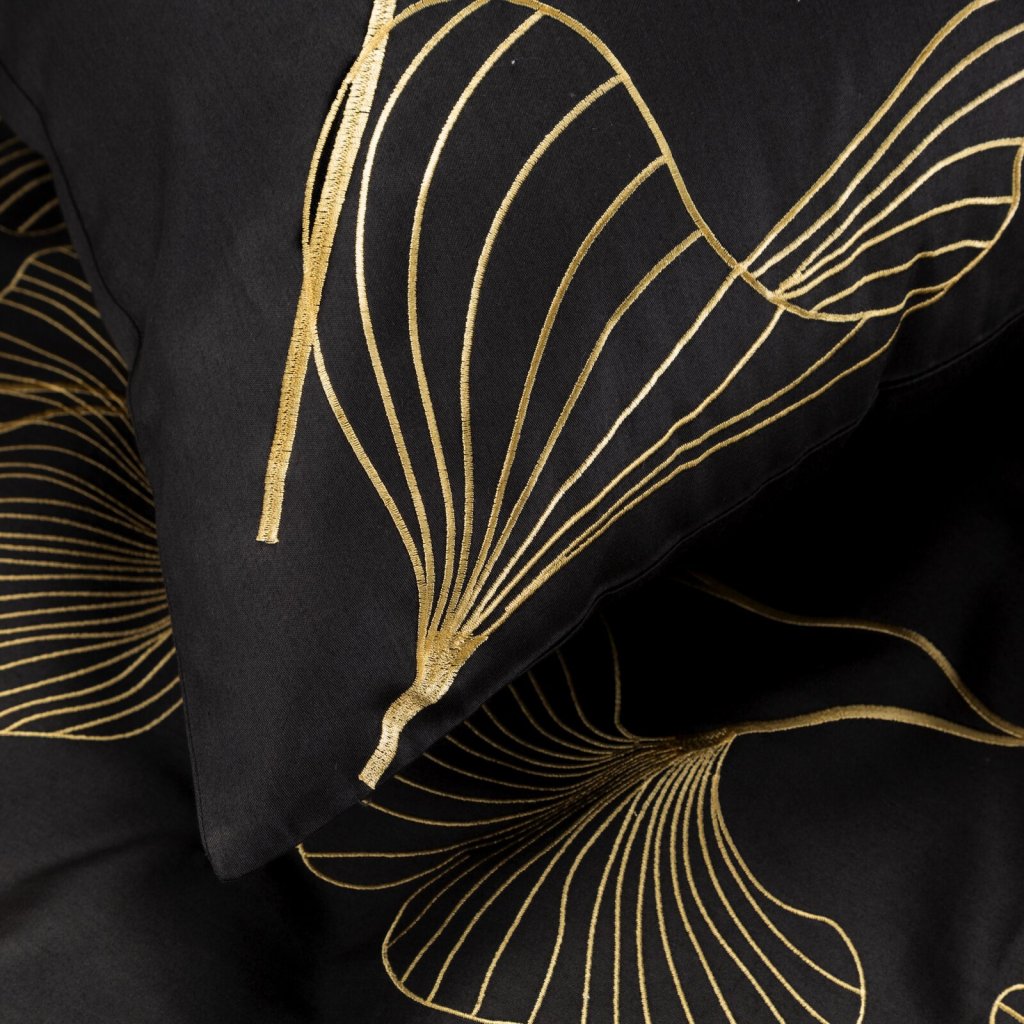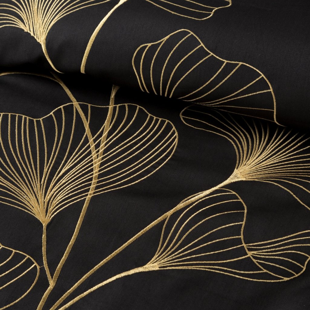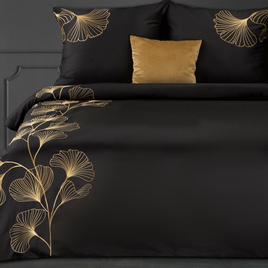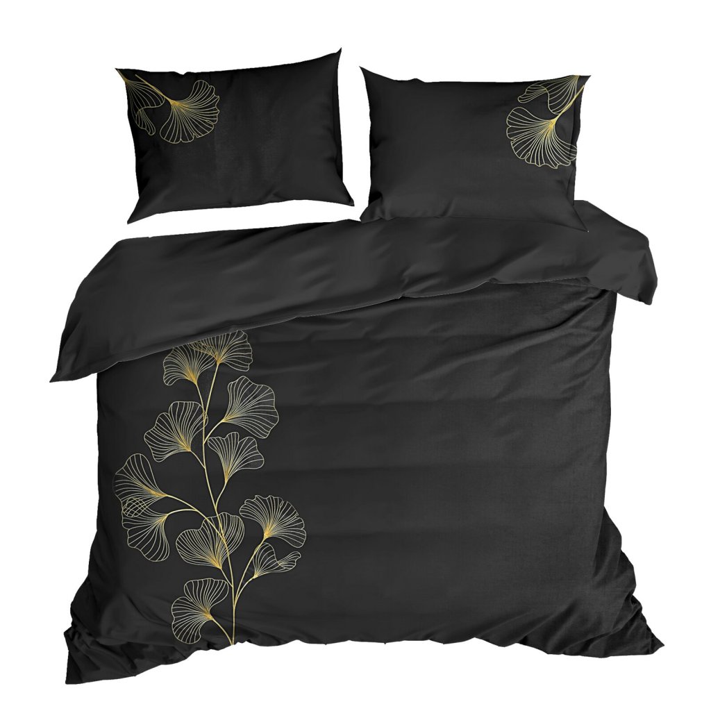 Bavlněné povlečení zdobené vyšívaným květinovým motivem se zapínáním na zip. Šířka: 160 cm, délka: 200 cm, 2ks 70X80 cm, barva: černá/zlatá, gramáž: 125 GSM, složení: 100% bavlněný satén.Doplňkové parametry