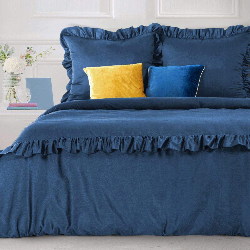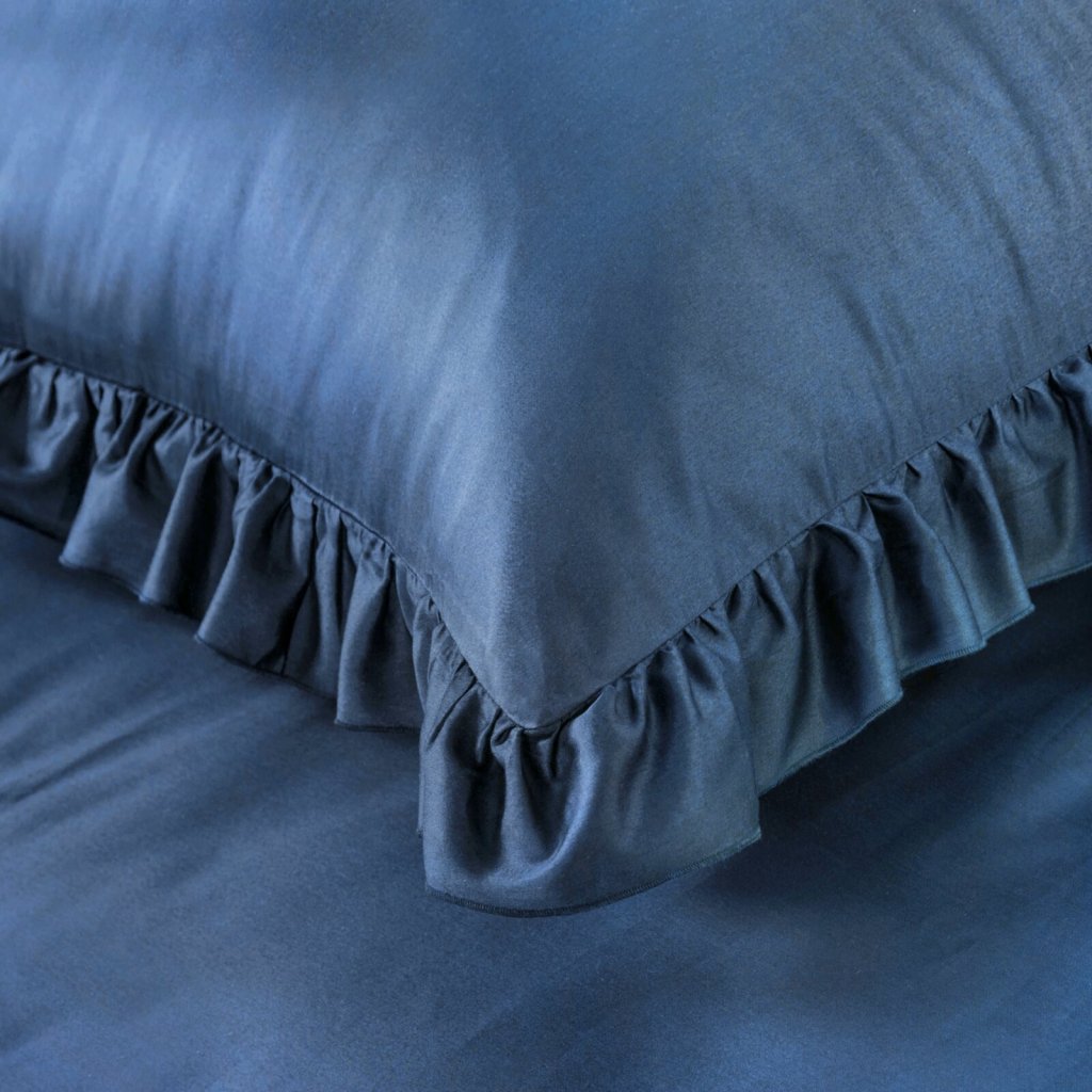Povlečení z makosaténu - nejkvalitnější bavlněný satén s volánem, šířka: 220 cm, délka: 200 cm, 2ks 70x80 cm, barva: tmavě modrá, gramáž: 125 GSM, složení: 100% bavlněný satén.Doplňkové parametry