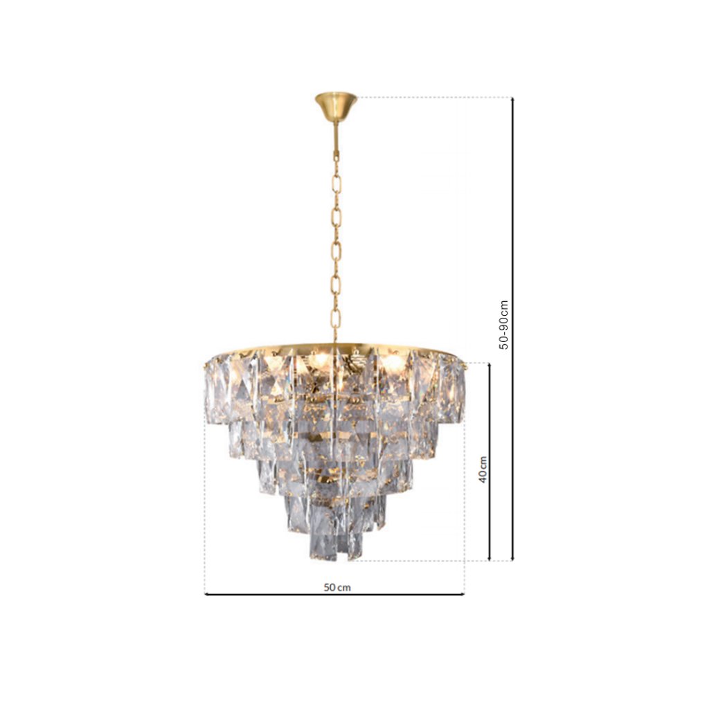 Lustr Chelsea o průměru 50 cm ve zlatém provedení je výrazné a ozdobné stropní svítidlo , které vnáší do interiéru noblesu a specifickou dekorativnost . Jeho bohatá konstrukce a lesklé detaily vytvářejí luxusní dojem , který osloví zejména milovníky výrazných interiérových prvků.