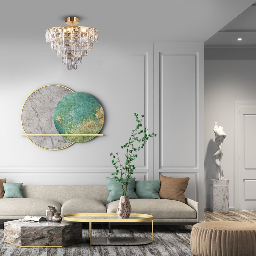 Lustr Chelsea II o průměru 50 cm ve zlatém provedení je bohaté a dekorativní stropní osvětlení , které přináší do interiéru nádech noblesy a stylové výjimečnosti . Jeho ozdobná forma a lesk křišťálových prvků vytvářejí vizuálně poutavý efekt , ideální pro reprezentativní prostory.