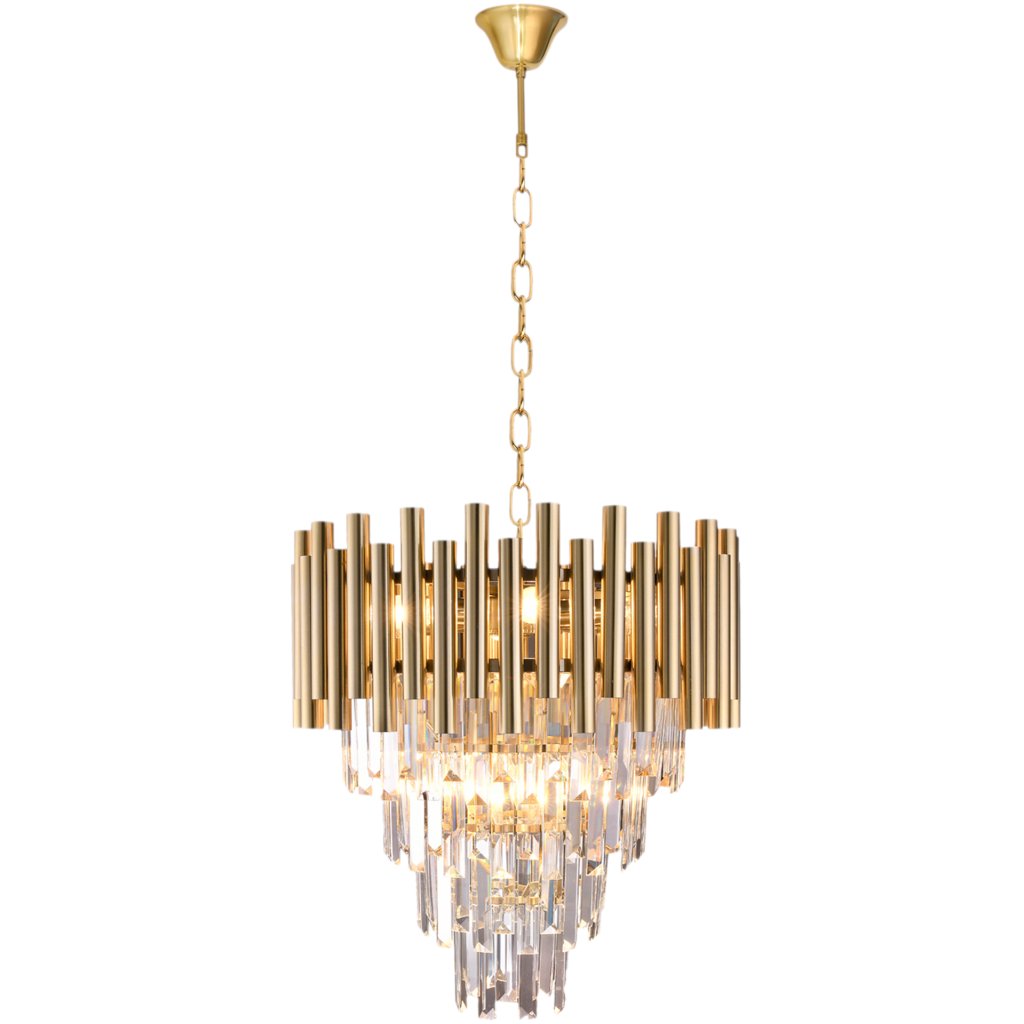 Lustr Madison o průměru 45 cm ve zlatém kovovém provedení je výrazným designovým prvkem , který spojuje moderní linie s noblesními detaily . Broušené křišťálové prvky v kombinaci s geometrickými trubkami ze zlaté oceli vytvářejí svítidlo s nezaměnitelným charakterem .