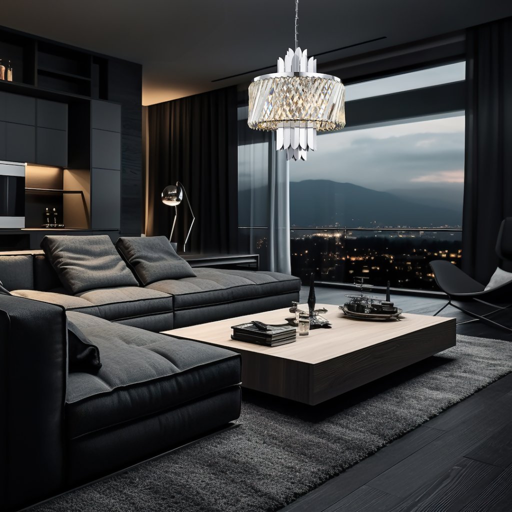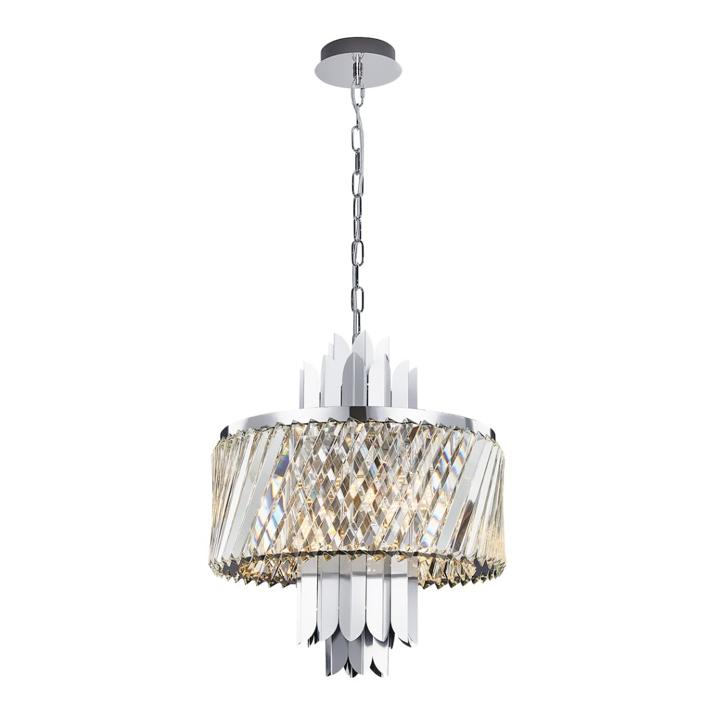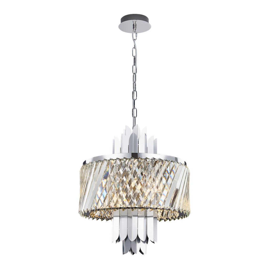 Chromová konstrukce z nerezové oceli dodává svítidlu moderní, čistý vzhled , zatímco křišťálové stínítko zaručuje dekorativní efekt a útulnou světelnou atmosféru . Díky kvalitním materiálům je lustr odolný a zároveň působí mimořádně elegantně.