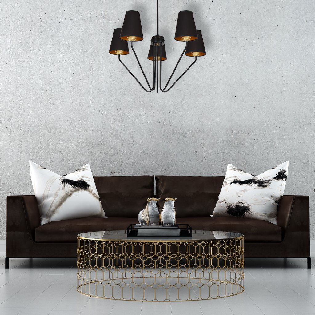 Lustr Victoria s pěti stínítky v černé textilní úpravě přináší klasický design v elegantně aktualizovaném provedení . Kónická stínítka působí tradičně, ale jejich osazení na charakteristicky zakřivených kovových ramenech se zlatým povrchem dodává celku nádech noblesy a originality .
