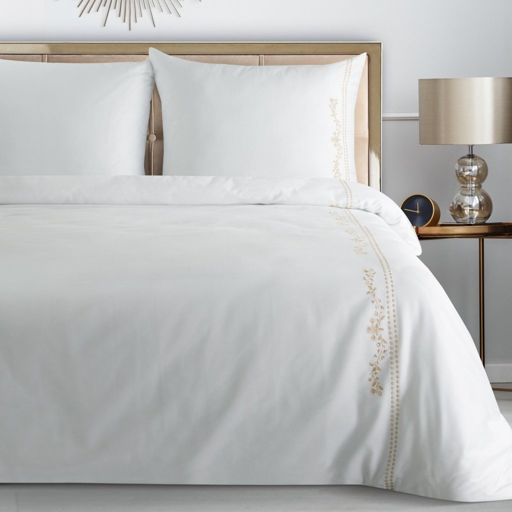 Bavlněné makosateenové povlečení RENIA, utkané z egyptské bavlny, je ideální volbou pro ty, kteří chtějí mít během spánku maximální pohodlí. Egyptská bavlna je známá svými dlouhými a jemnými vlákny, díky nimž je tkanina mimořádně měkká, hladká a odolná. Povlečení je zdobeno jemnou výšivkou s květinovým motivem podél okrajů povlečení, tento rafinovaný detail dodává celé soupravě luxusní nádech. Výrobek má certifikát Oeko-Tex Standard 100, což znamená, že neobsahuje škodlivé látky a je bezpečný pro pokožku. Šířka: 220 cm, délka: 200 cm, povlak na polštář: 2 ks 70x80 cm, barva: bílá, gramáž: 125 GSM, složení: 100% bavlna.Doplňkové parametry