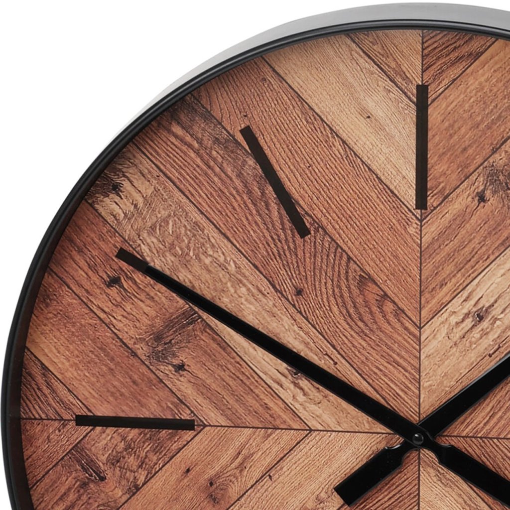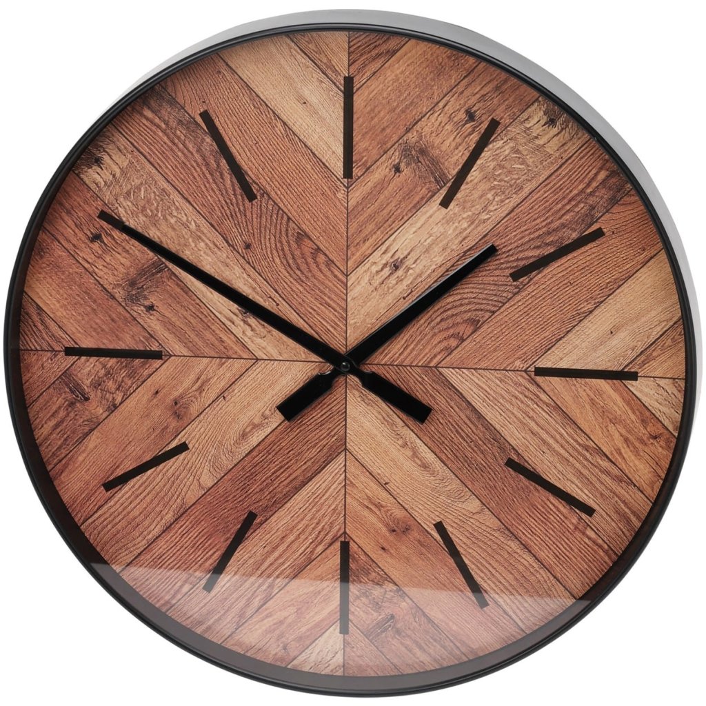 Hodiny v přírodních barvách jsou krásným dekorativním prvkem, který učiní vaši kuchyni, obývací pokoj či ložnici ještě krásnější. Ciferník je za sklem. Černý okraj hodin a ručičky krásně ladí s pozadím imitace jedlového dřeva.Doplňkové parametry