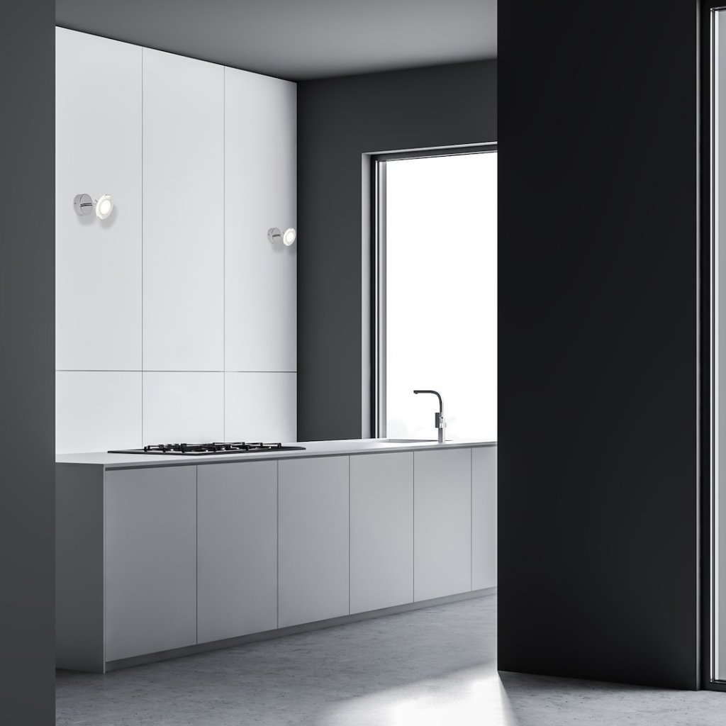 Moderní nástěnné svítidlo s chromovým kovovým stínítkem zaujme kompaktními rozměry a elegantním, inovativním tvarem . Tělo svítidla je vyrobeno z kvalitních materiálů a v sobě ukrývá úsporný LED modul o výkonu 5 W , který poskytuje světelný tok 350 lm .
