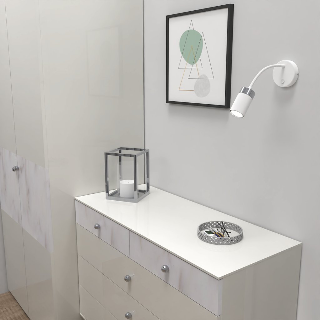 Model je vybaven vypínačem přímo na těle svítidla , což zajišťuje pohodlné ovládání bez nutnosti zásahu do elektroinstalace. Díky bodovému světlu je svítidlo výbornou alternativou ke klasickým nočním lampám. Bílá povrchová úprava doplněná o chromové detaily působí svěže, čistě a hodí se zejména do minimalistických nebo skandinávských interiérů .