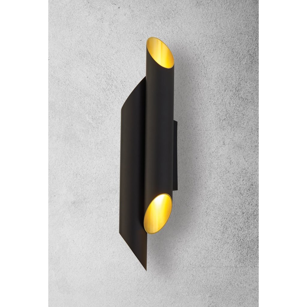 Nástěnné svítidlo Libra se dvěma černými kovovými stínítky zdobenými zlatými detaily čerpá inspiraci z tradičních hudebních nástrojů – svým tvarem připomíná píšťaly varhan, jaké známe z chrámů a koncertních síní. Oválný, prodloužený tvar a jemně zkosené konce mu dodávají umělecký a nadčasový charakter .