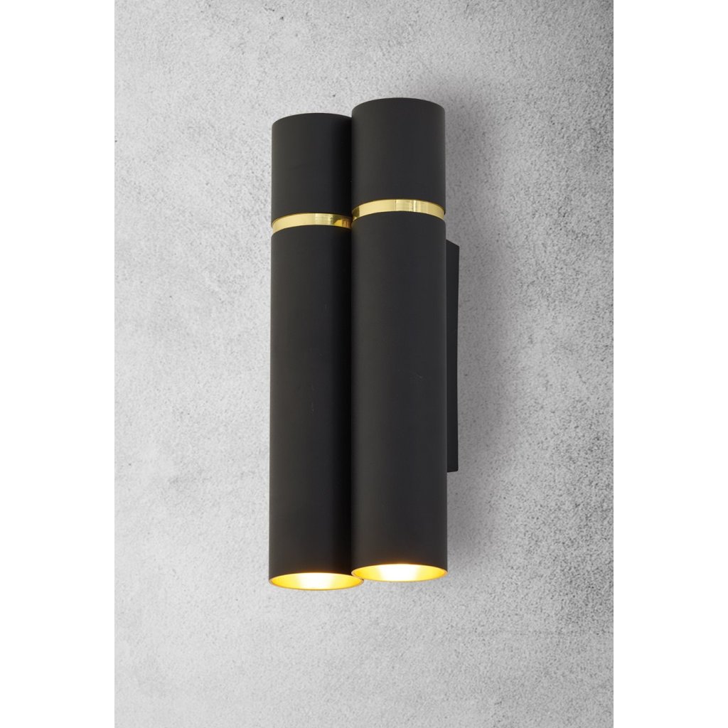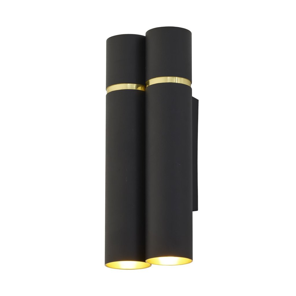 Dvojité nástěnné svítidlo Lynx se zlatými panely a černým kovovým tělem je výrazným designovým prvkem, který okamžitě upoutá pozornost. Tvar prodloužených tubusů se zlatým akcentem evokujícím elegantní šperky a detaily architektury přináší do interiéru noblesu a půvab.