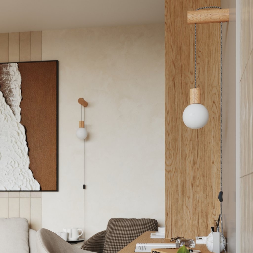 Nástěnné svítidlo NIMBI je moderní svítidlo s elegantní kombinací dřeva a stínidla z matného skla. Jeho charakteristický minimalistický design podtrhují detaily, jako je textilní šňůra s černobílým výpletem. Svítidlo poskytuje teplé, rozptýlené světlo, které je ideální pro intimní interiéry.Doplňkové parametry