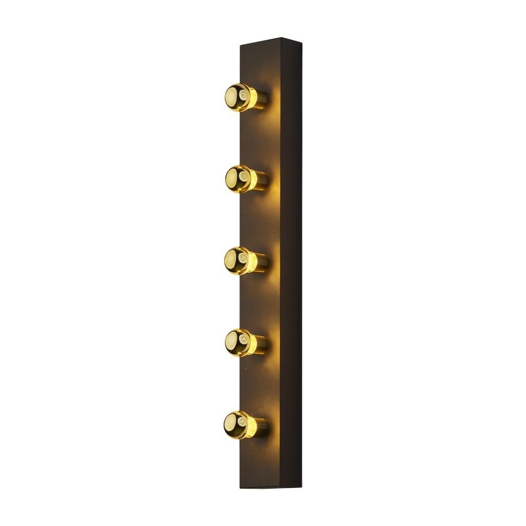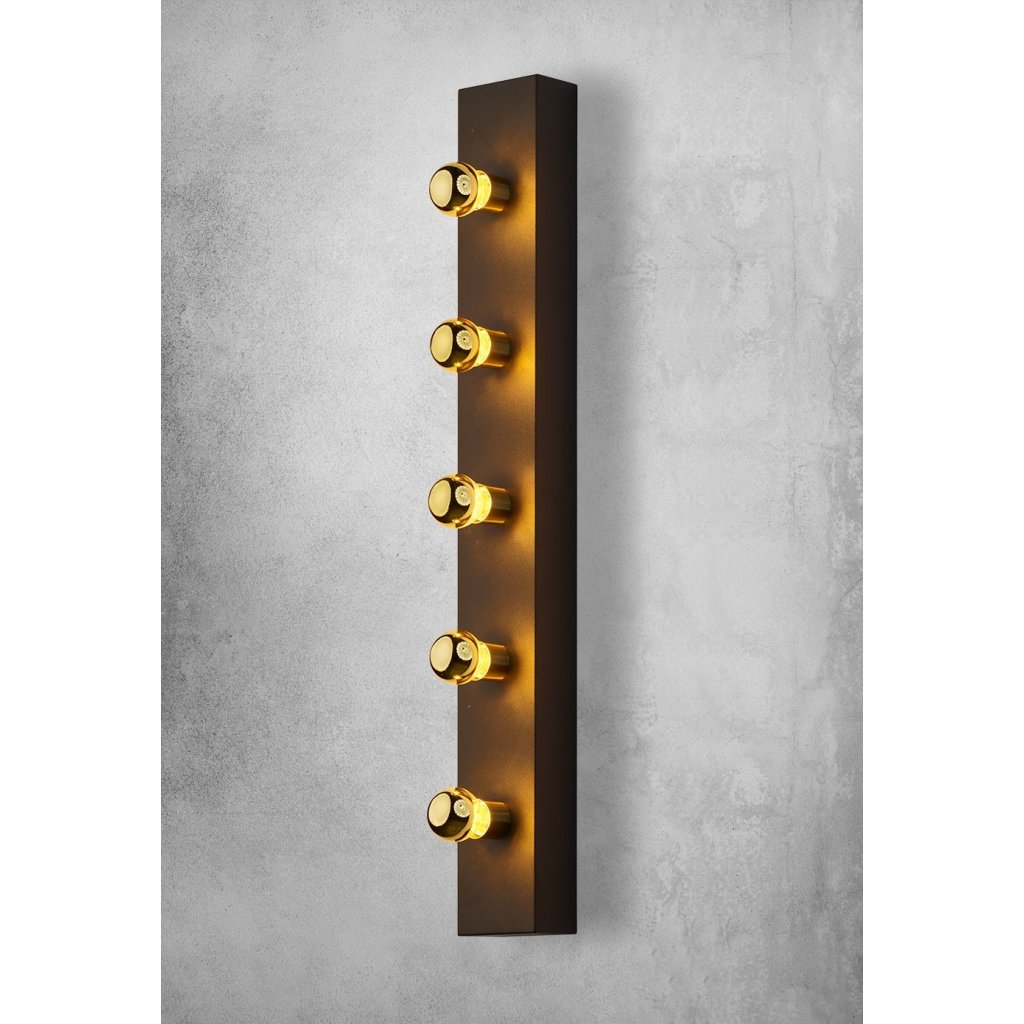 Nástěnné svítidlo Phoenix s černým tělem a pětinásobným světelným zdrojem je inspirováno osvětlením divadelních šaten , kde zrcadla obklopují pravidelně rozmístěné žárovky. V tomto případě vytvářejí žárovky světelný rám v podobě elegantního obdélníku , který rozptyluje světlo soustředěně, ale zároveň jemně a stylově zvýrazňuje prostor.