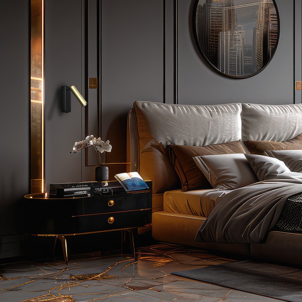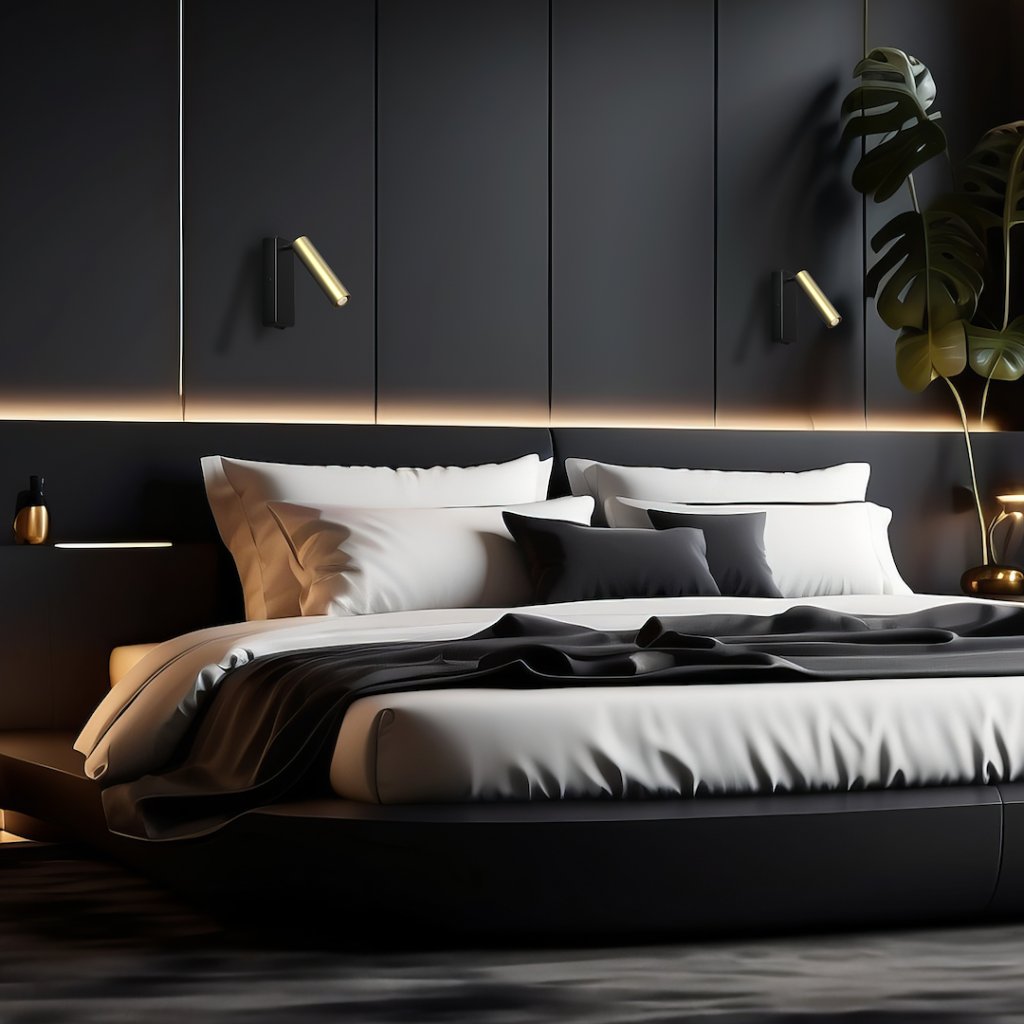 Nástěnné svítidlo z kolekce Santi v kombinaci černé konstrukce a zlatého kovového stínítka představuje ideální řešení pro moderní osvětlení ložnice . Jeho čisté linie a minimalistická forma dodávají prostoru stylový a útulný charakter.