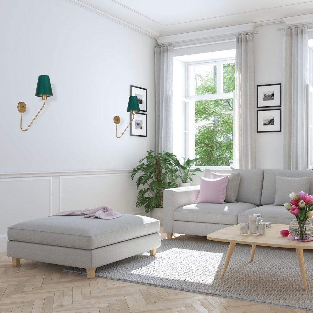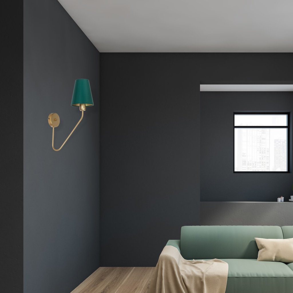 Nástěnné svítidlo Victoria se zeleným textilním stínítkem a mosaznými detaily spojuje klasickou eleganci s jemně výstředním designem . Tradiční stínítko ve tvaru mírného lichoběžníku je upevněno na elegantně zakřiveném kovovém rameni , což dodává svítidlu půvab a šarm.