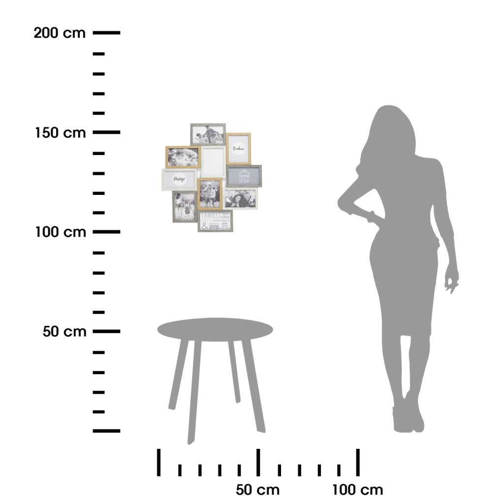 Nástěnný fotorámeček Nestia o rozměrech 56 × 47 cm je vkusná kolážová sestava na 10 fotografií , která spojuje teplé dřevěné tóny s bílou a šedou . Tato vyvážená barevná kombinace přináší do interiéru pocit útulnosti a harmonické elegance , čímž se rámeček stává ideální volbou do obývacího pokoje, předsíně či ložnice .